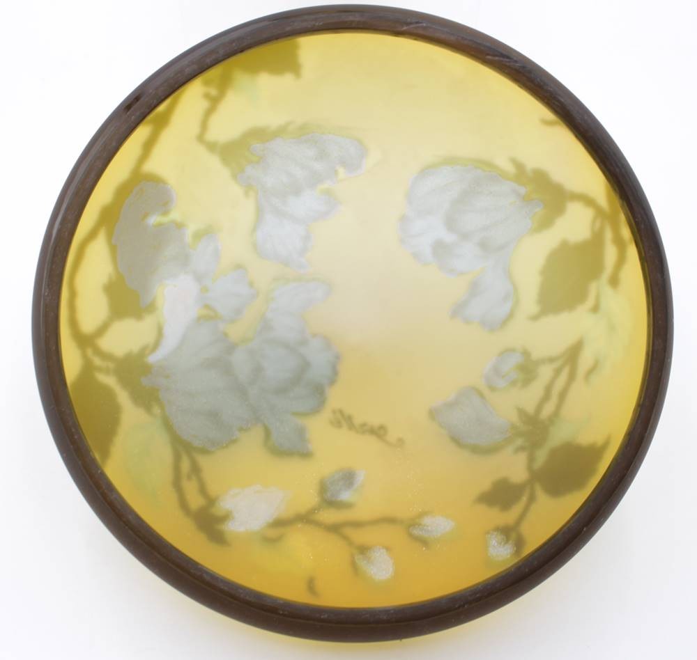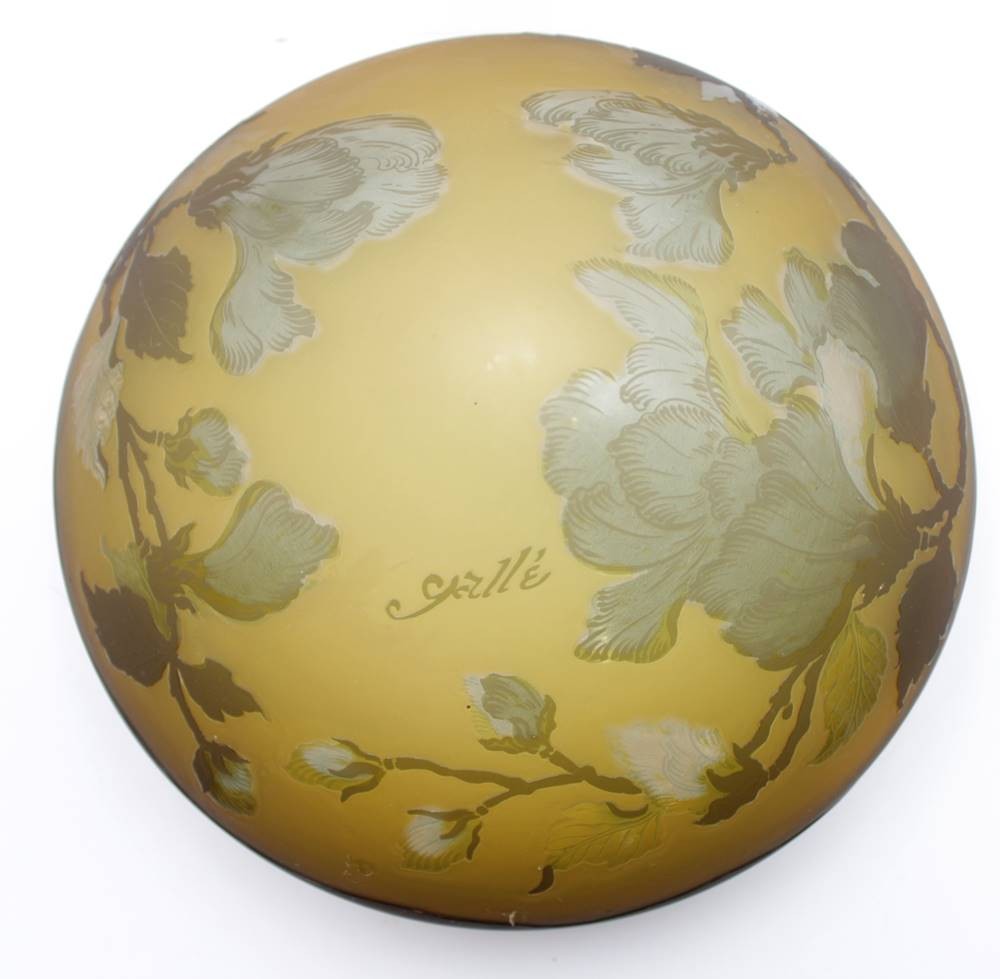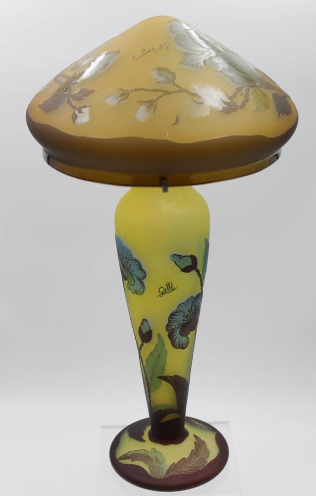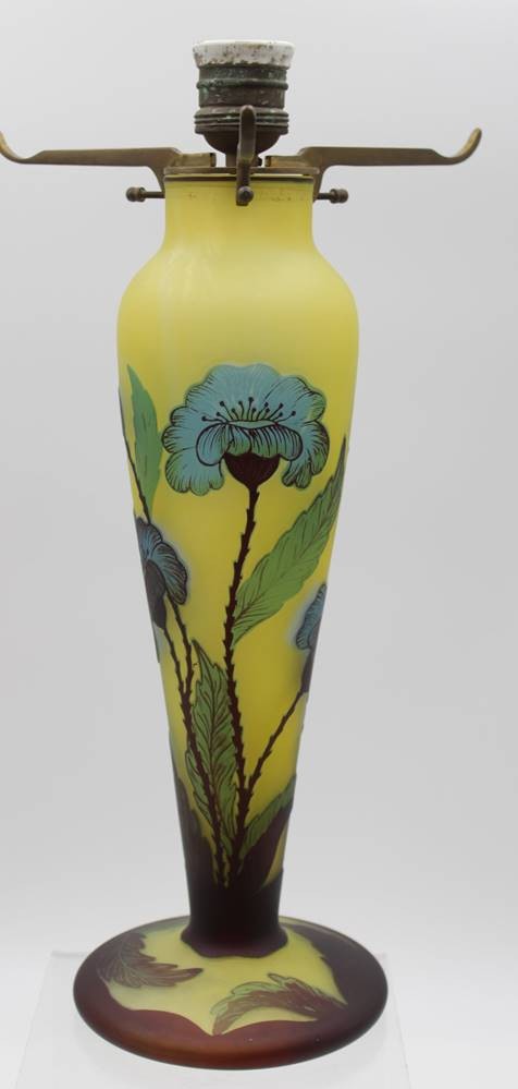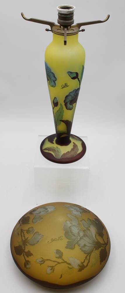 Tischlampe, bez. Gallé, alte Porzellanfassung, original???, geätzt und geschnittenes Jugendstildekor, Kabel fehlt, H-47cm D-25cm. [1]