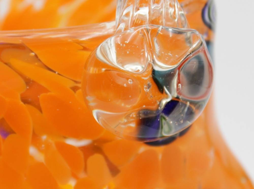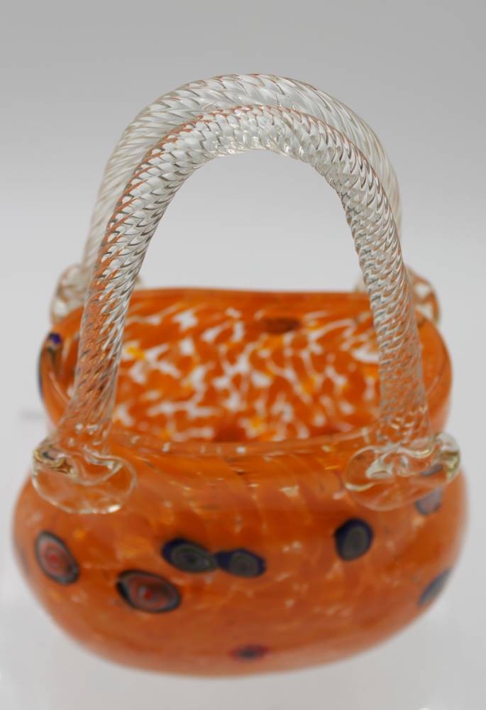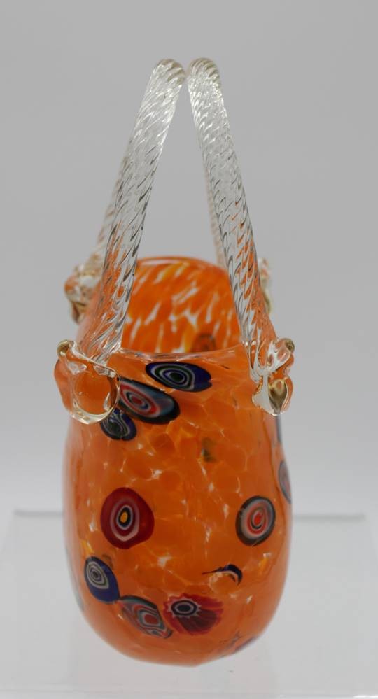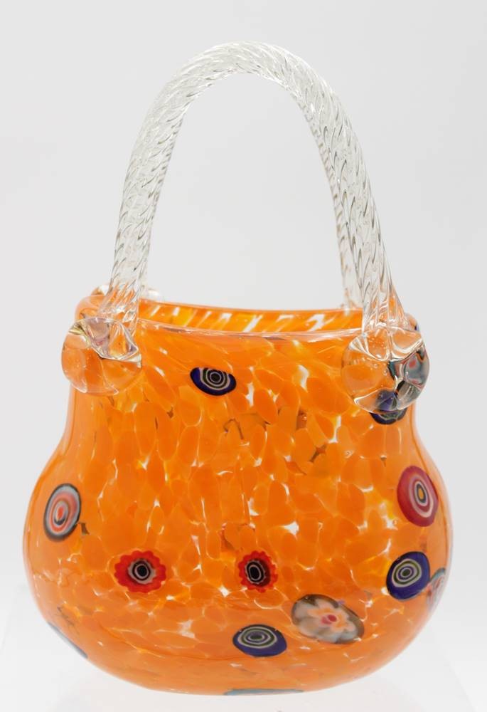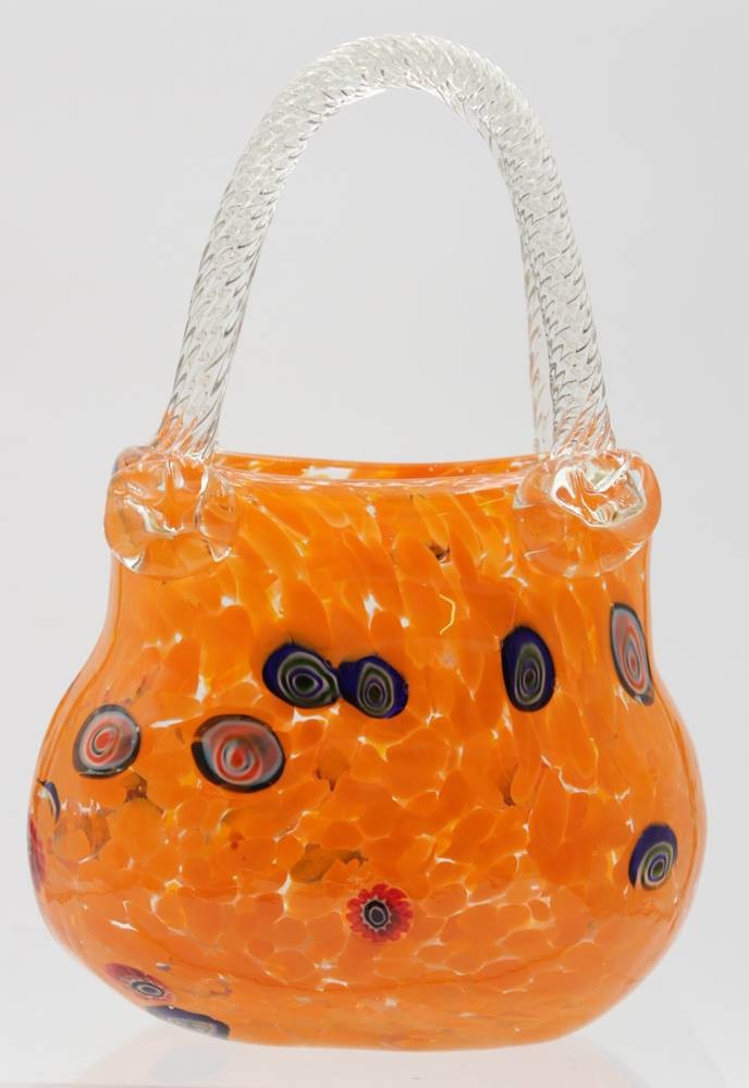 Vase in Taschenform, wohl Murano, farbige Einschmelzungen, ca. H-20cm B-14cm. [1]