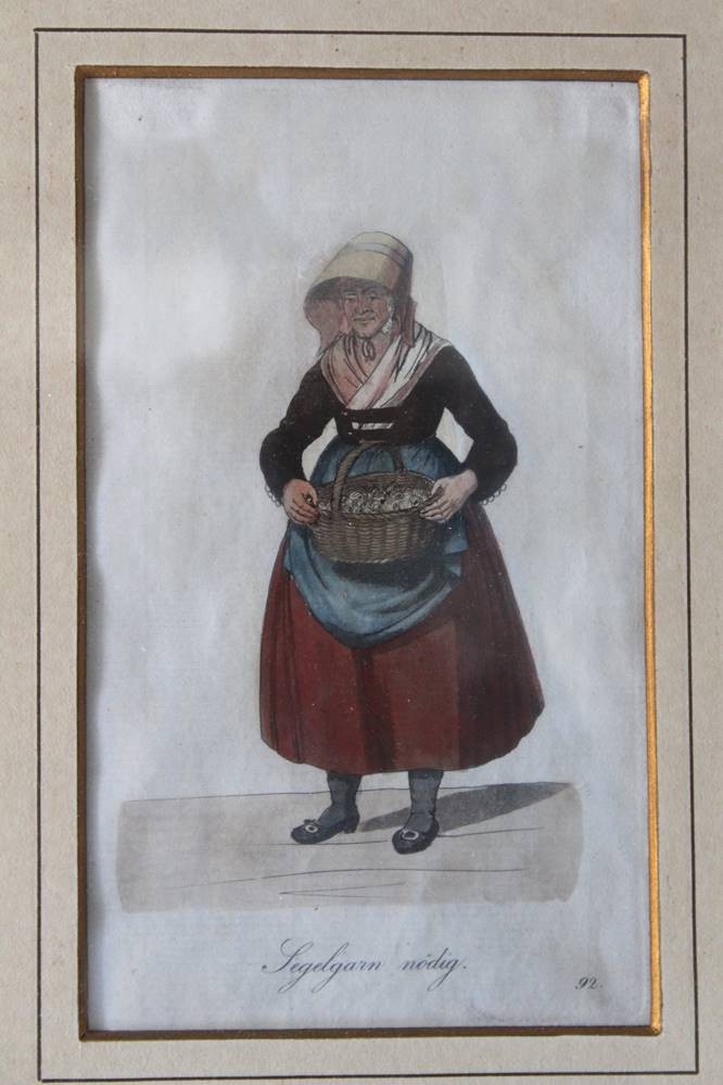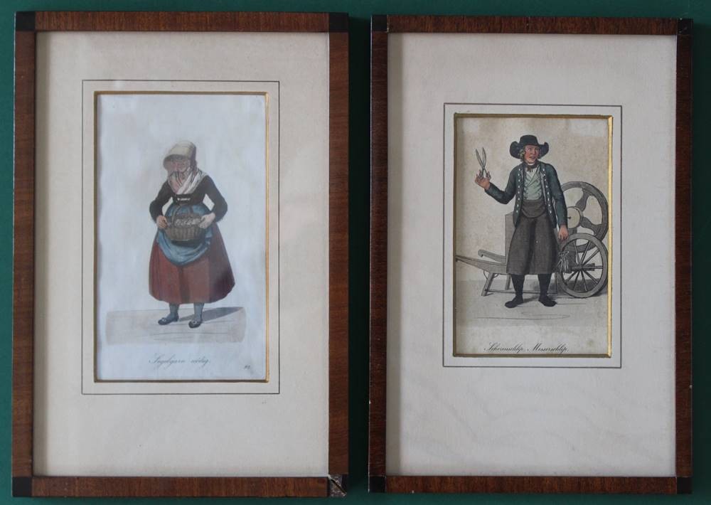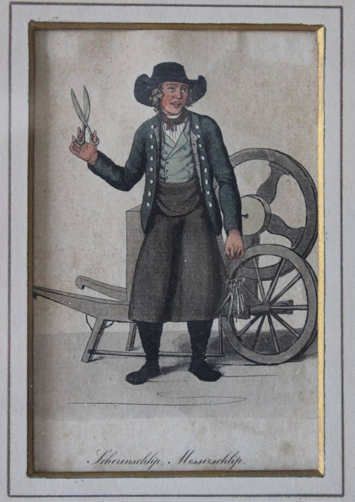 2 Lithografien um 1850, handcoloriert, Berufe, Scherenschleifer und Garnverkäuferin, ger/Glas, RG 28x19 cm [1]