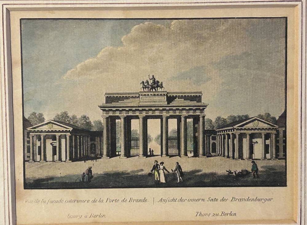 2x Anichtenstiche um 1815, Brandenburger Tor und Schloss Sanssouci , Aquatinta , Blick vom Pariser Platz auf das Brandenburger Tor, ger/Glas, RG ca 26x30 cm [1]