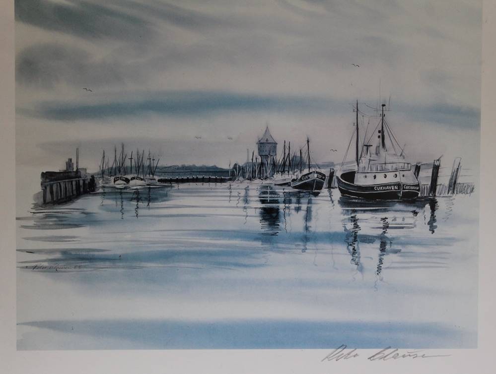 2x div. Grafiken mit Cuxhaven Motiven, W.Relisch und Peter Clausen, je gerahmt/Glas, RG ca. 33 x 42cm [1]