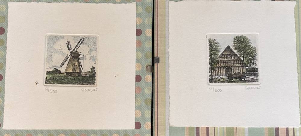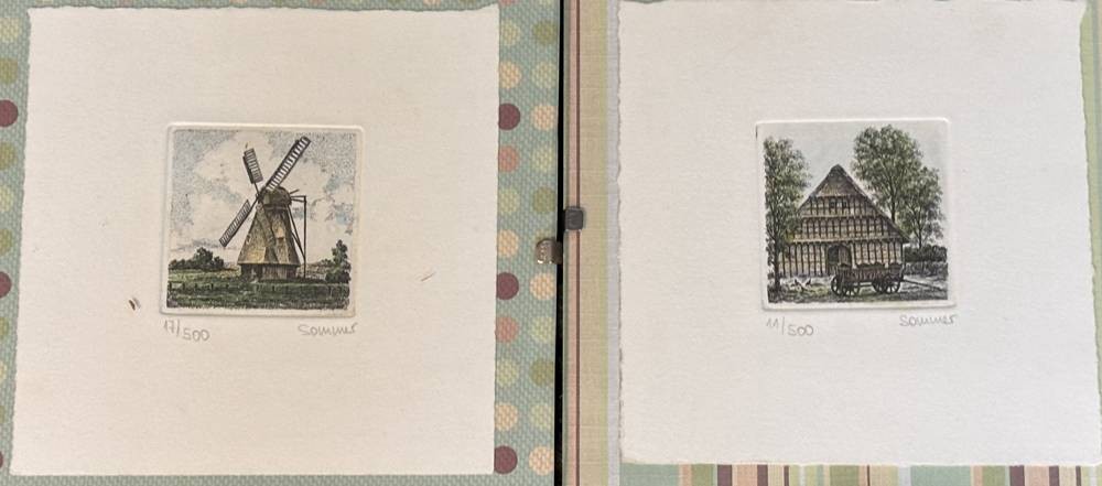2x kl. Farbradierungen, sign. Sommer, /500 er Auflage, je 12x12 cm [1]