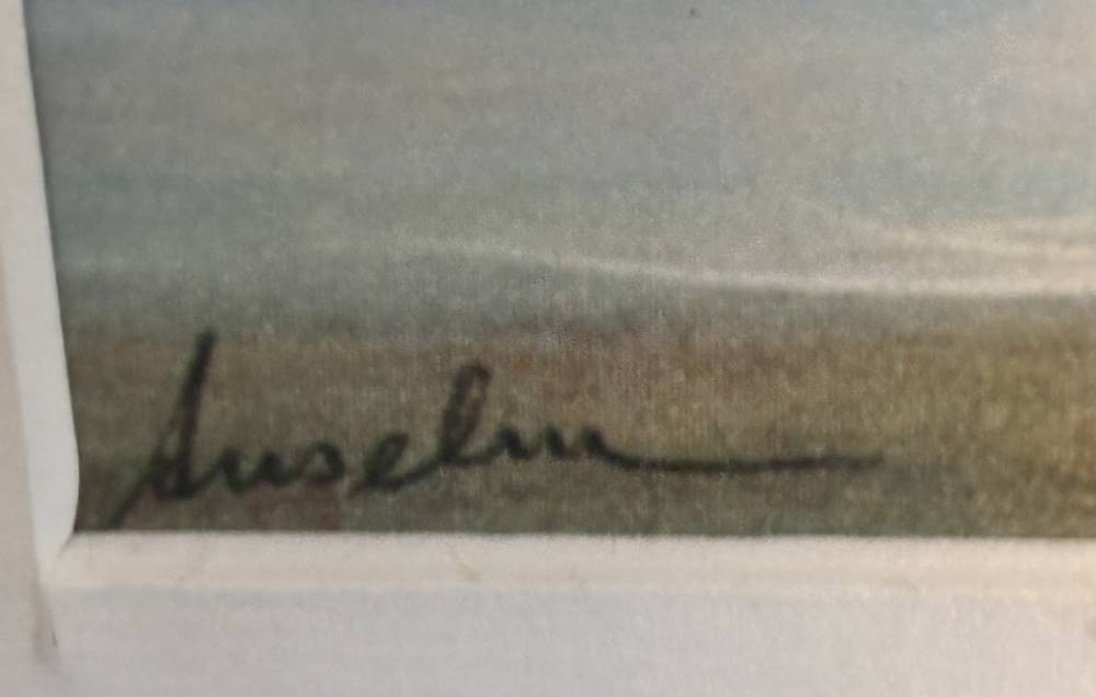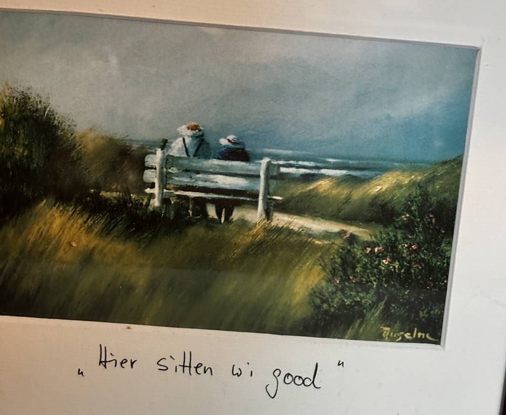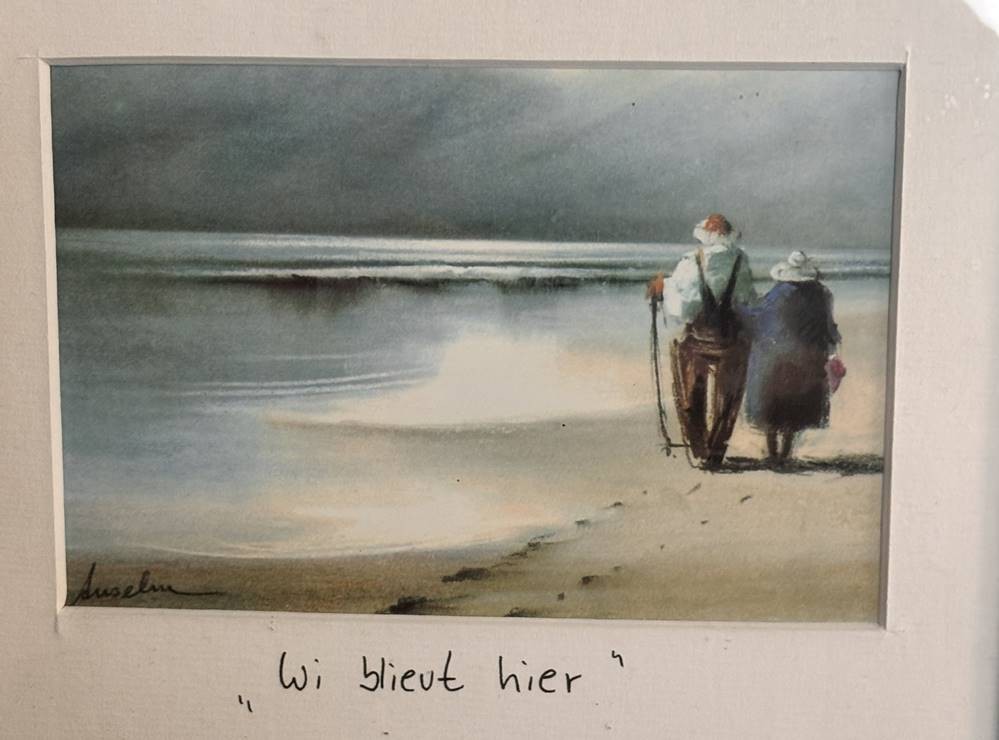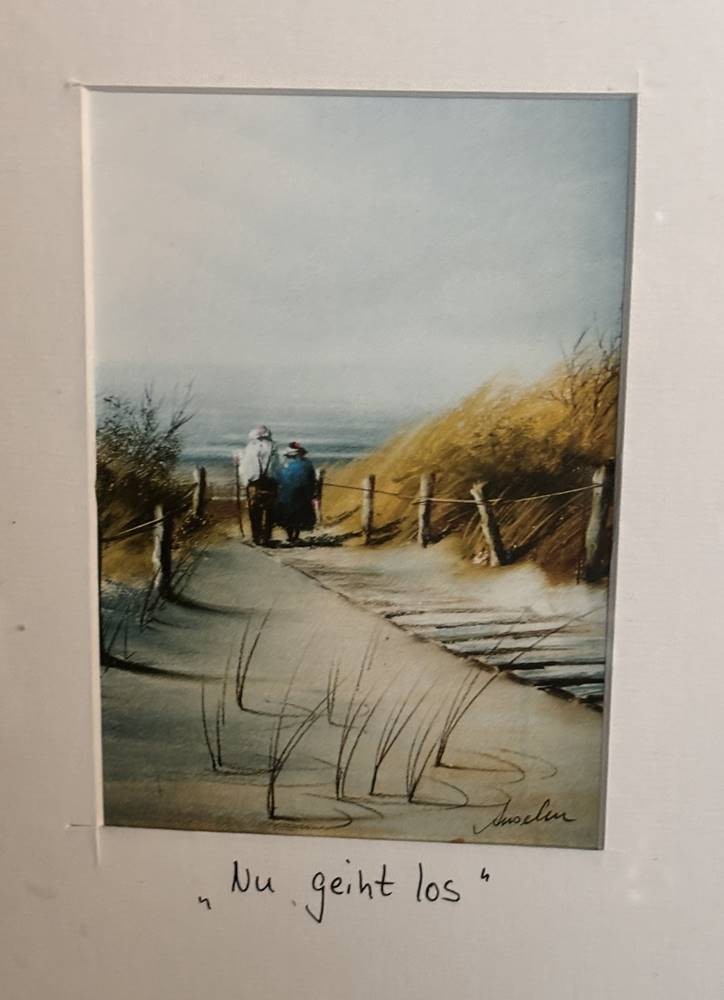 3 Kunstdrucke in einem Rahmen, plattdeutsch betitelt, ger/Glas, RG 65x24 cm, nach Motiven des "Inselmalers" Anselm Prester aus Langeoog. [1]