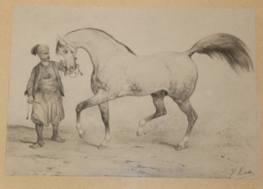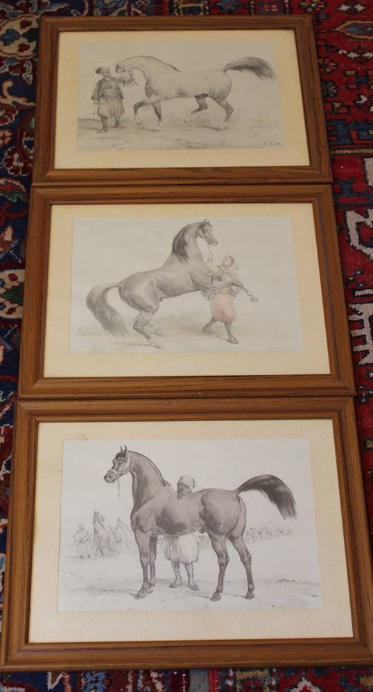 3x alte Drucke mit Pferdedarstellugen, 1x bez. Ajami?, je gerahmt/Glas, RG 35 x 45cm