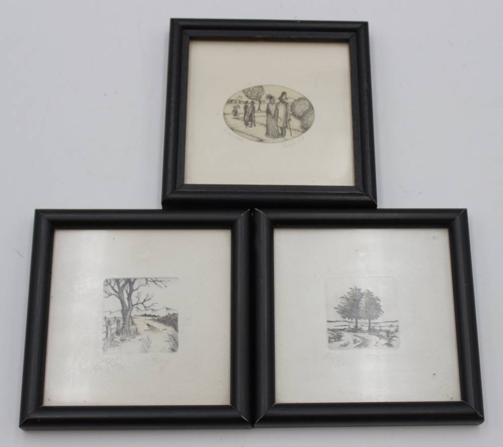 3x div. kl. Radierungen, Personen und 2x Landschaften, je signiert, ca. RG 11,5 x 11,5cm. [1]