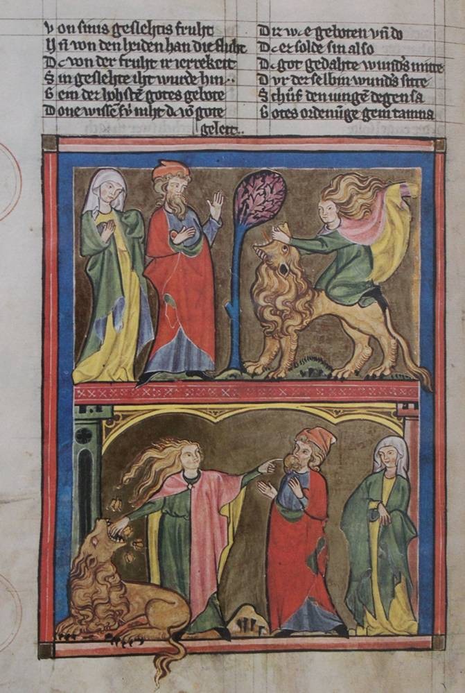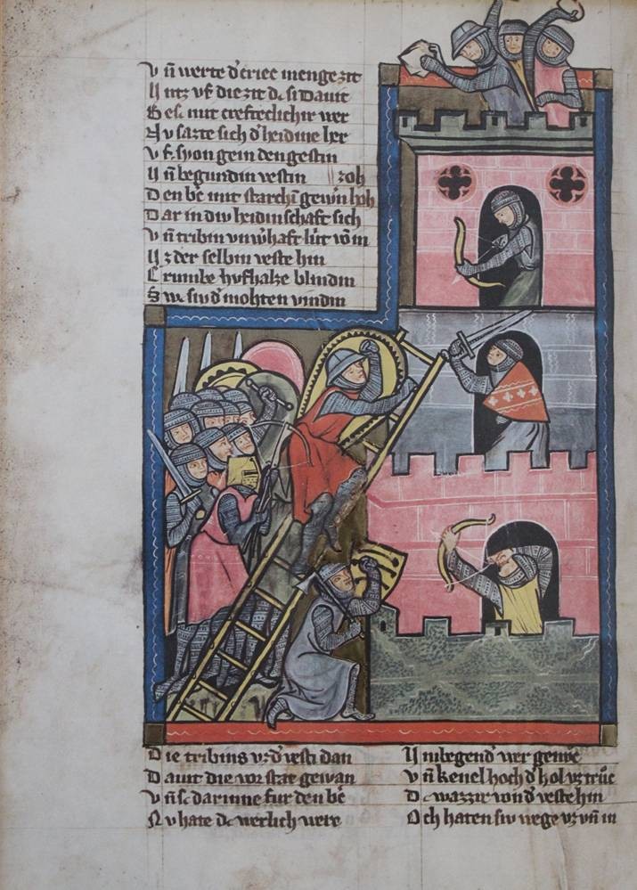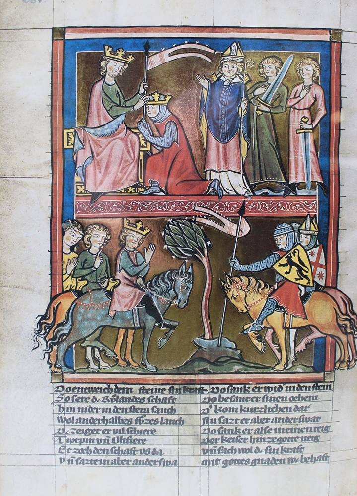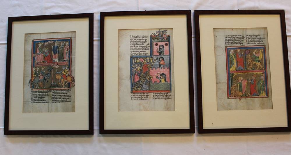 3x gerahmte Buchseiten aus der Weltchronik von Rudolf von Ems, je gerahmt/Glas, Blätter stockfleckig, Alter?, je RG 42,5 x 32cm [1]