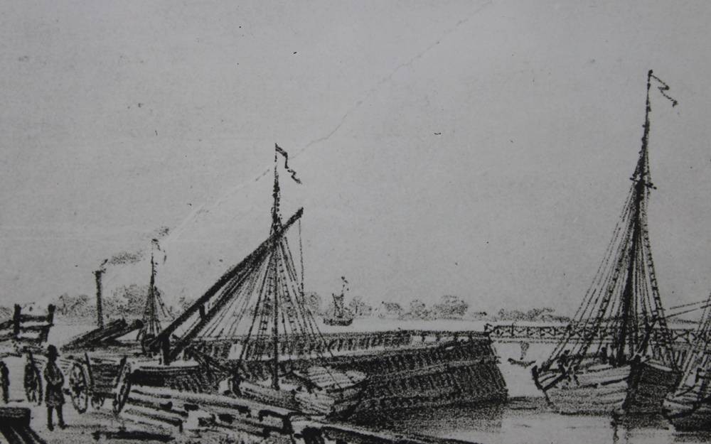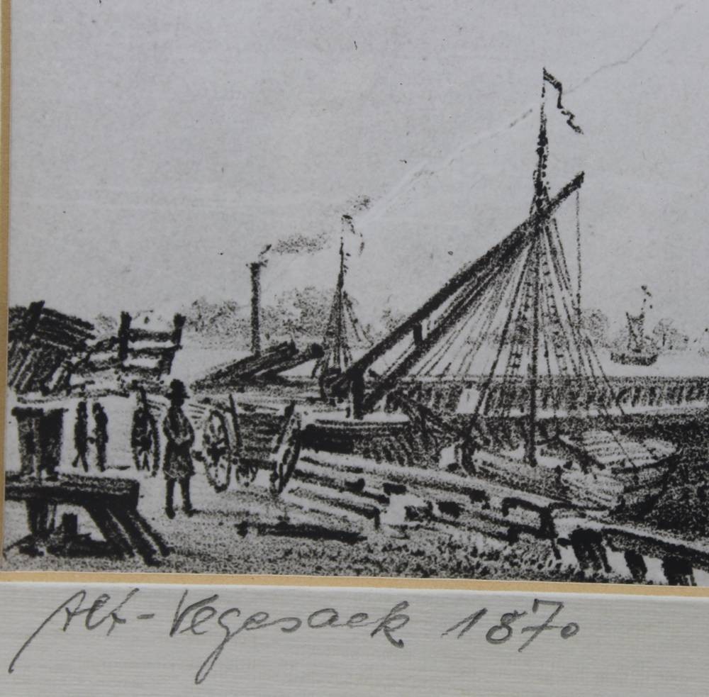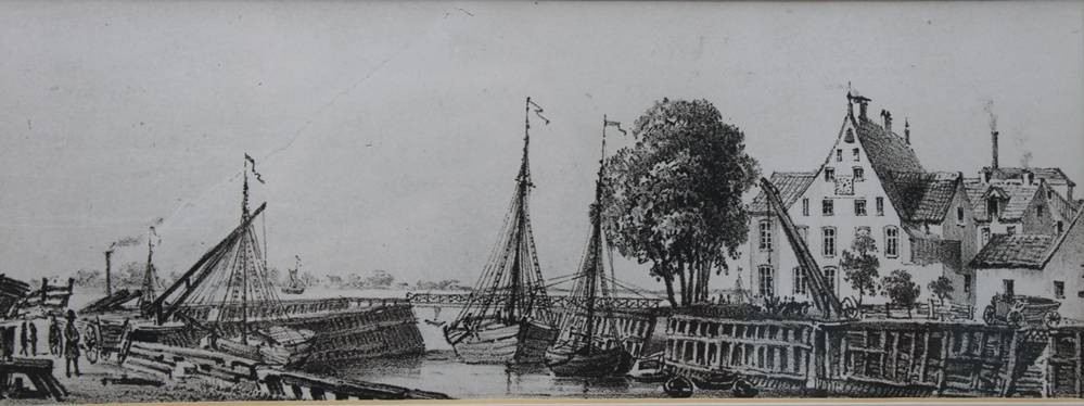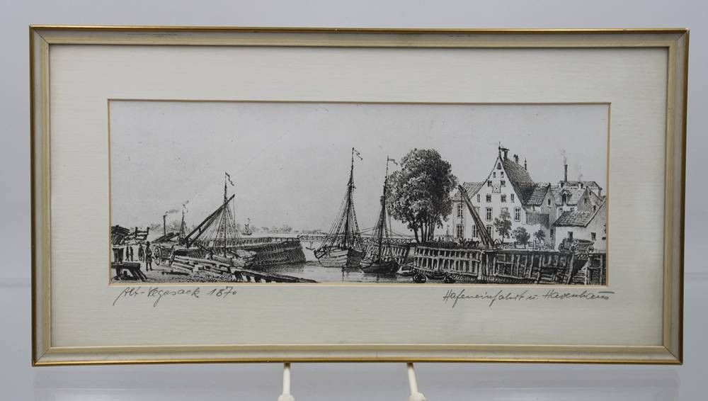 Alt-Vegesack, Hafeneinfahrt und Havenhaus. Druck, ger./Glas, RG 19 x 37,5cm. [1]