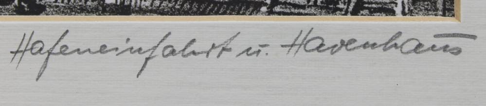 Alt-Vegesack, Hafeneinfahrt und Havenhaus. Druck, ger./Glas, RG 19 x 37,5cm.