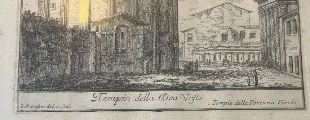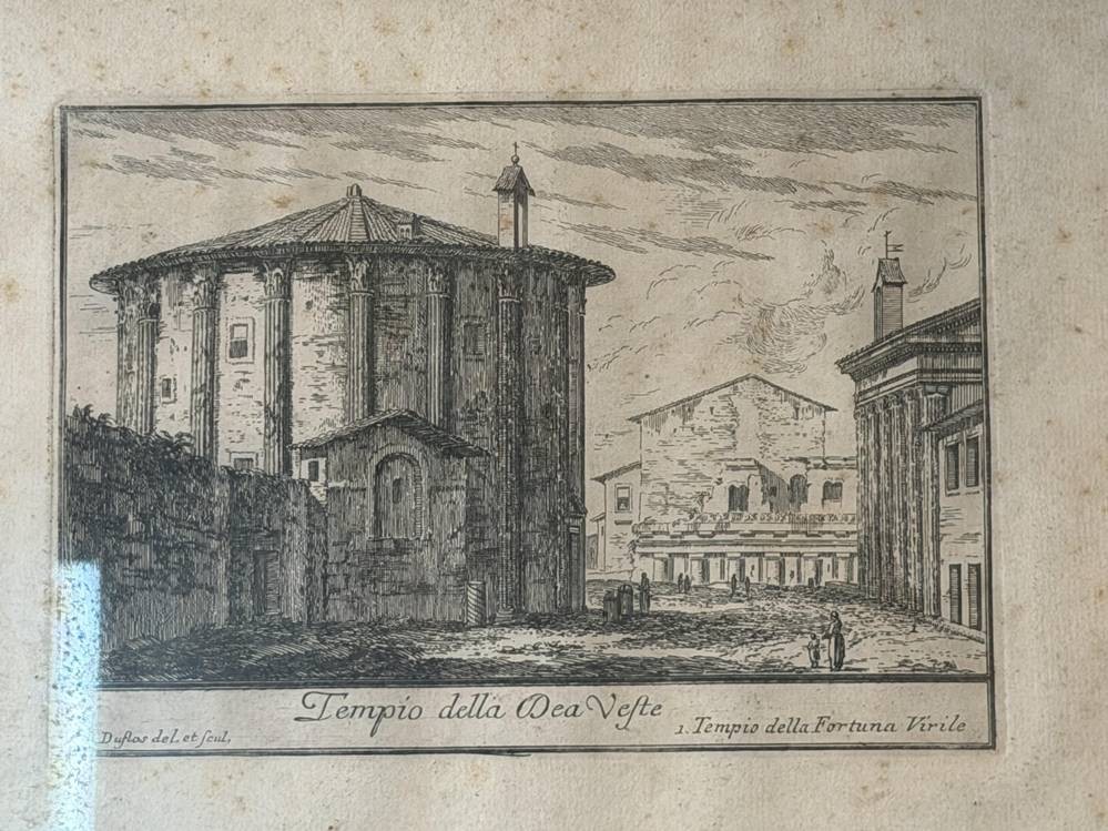 alte Radierung "Tempel der Vesta auf dem Forum Romanum" ger/Glas, stockfleckig