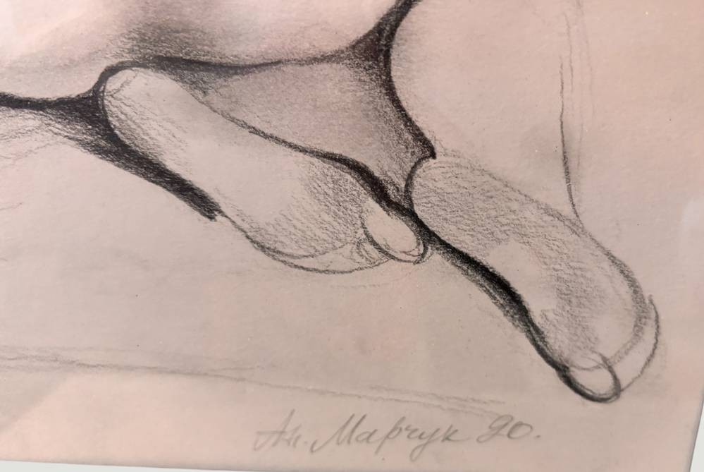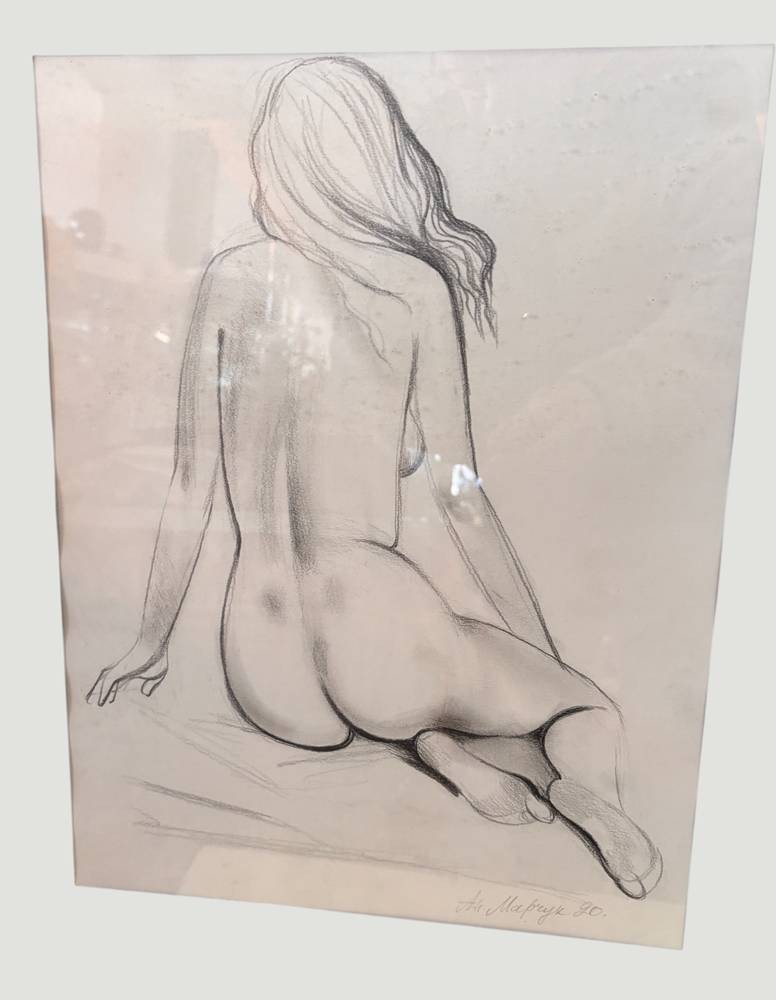 Anatoly MARCHUK (1956) Rückenakt der Anna POMYKALSKA (Ukrainisches Künstlerpaar), Zeichnung, ger/Glas, RG 51x41 cm, in 1990 Kunstaustellung beim Kunstverein Cuxhaven [1]