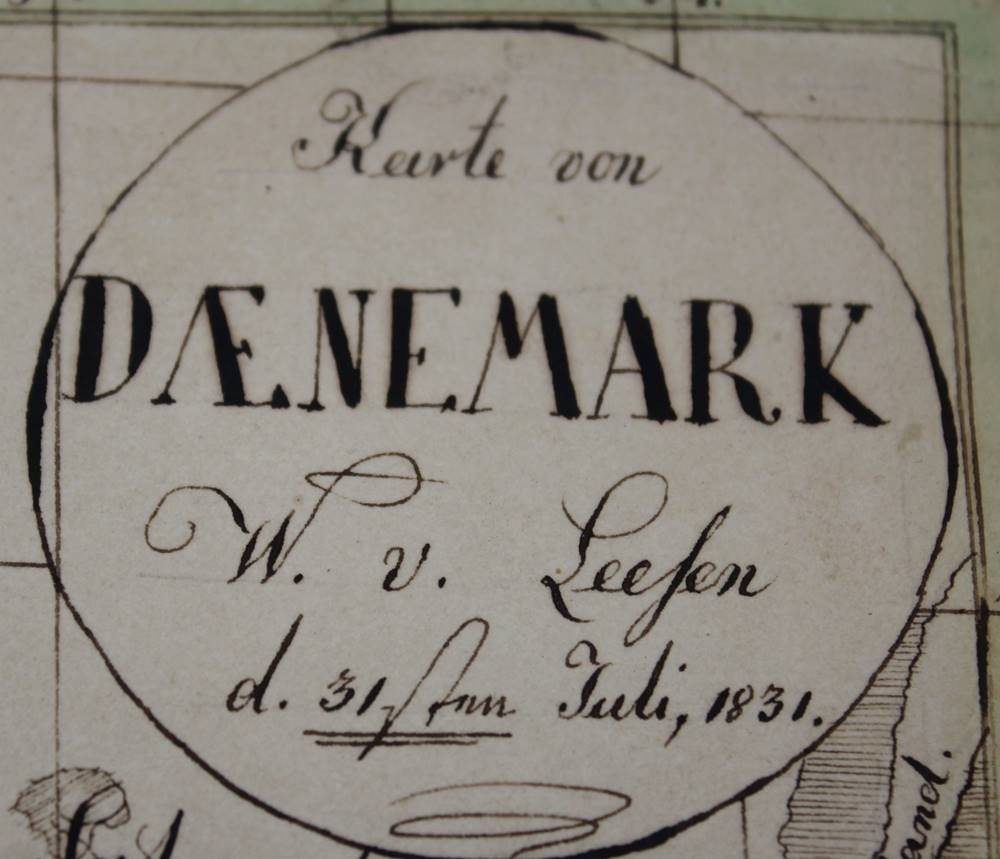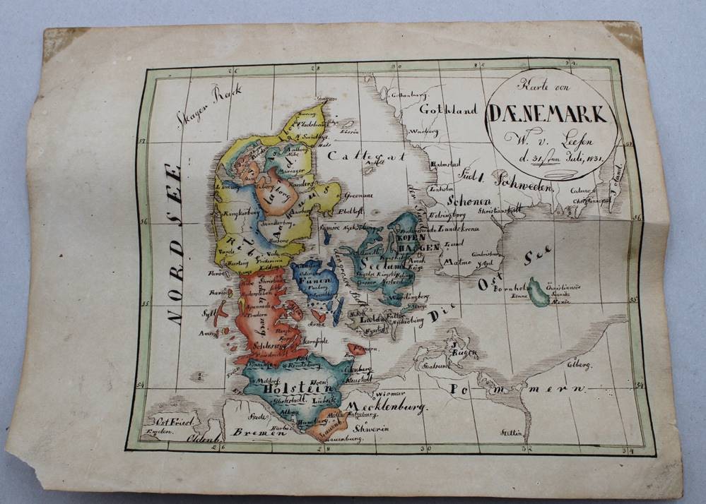 antike color. Karte von Dänemark, datiert 1831, ungerahmt, Blatt mit Läsuren, ca. 21 x 27,5cm [1]
