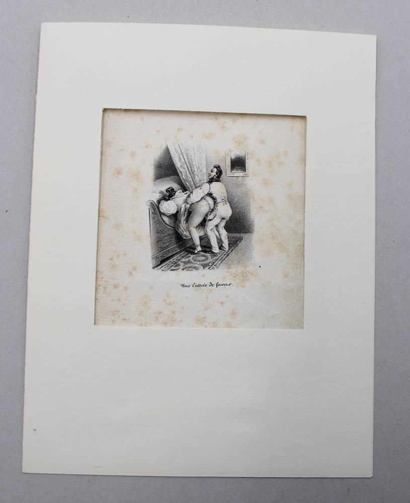 französische Erotika- Lithografie, „Une Entrée de faveur“, ungerahmt in Passepartout, Altersspuren, BG 18 x 14cm, 26 x 20cm [1]
