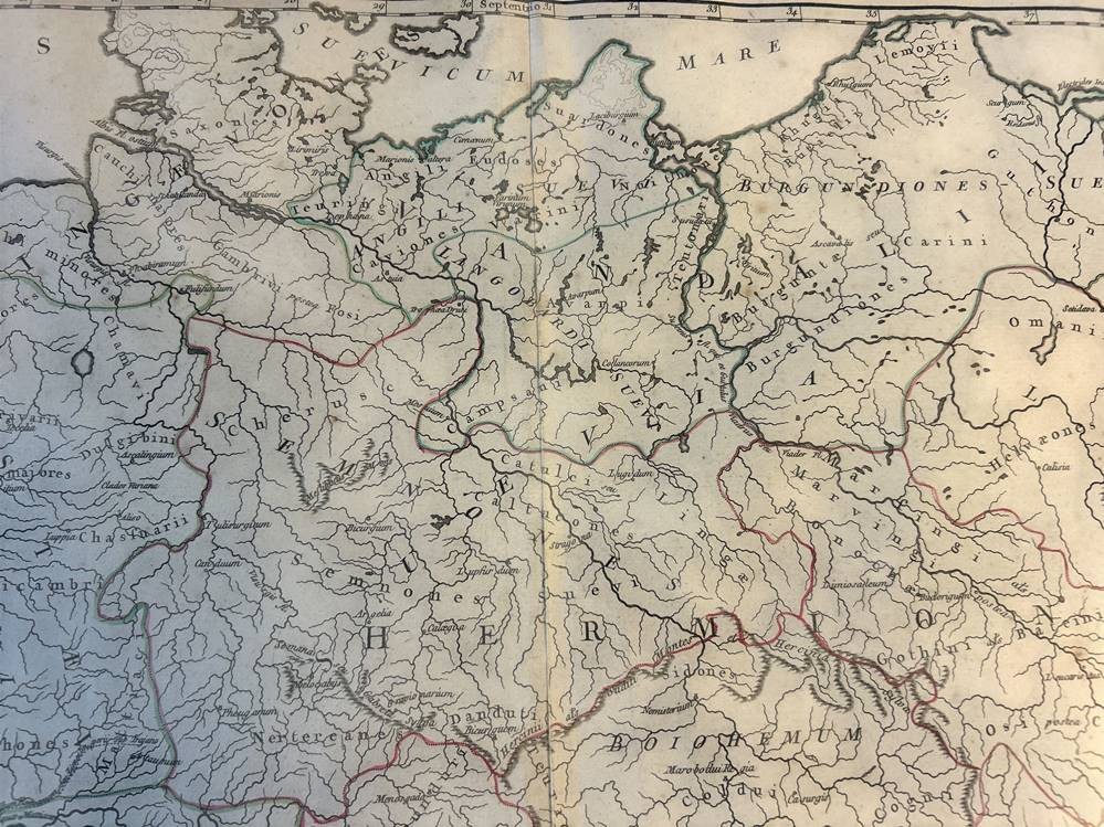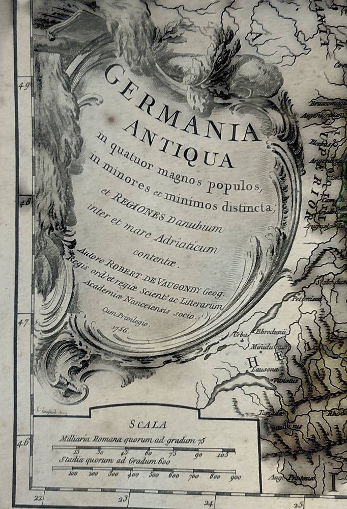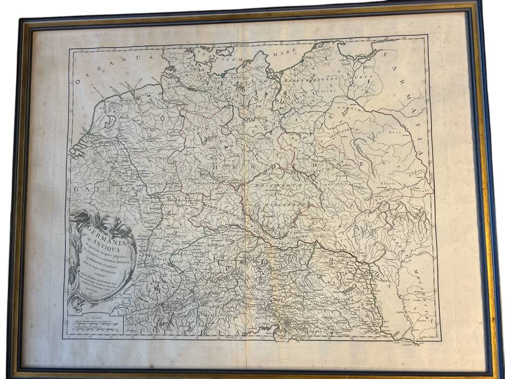 Gilles ROBERT DE VAUGOND (1688-1766) grenzcolorierte Landkarte "Germania Antiqua" dat. 1756, ger/Glas, RG 58x74 cm [1]