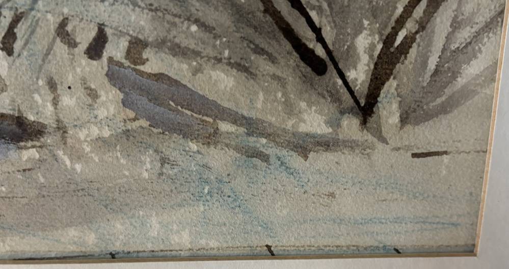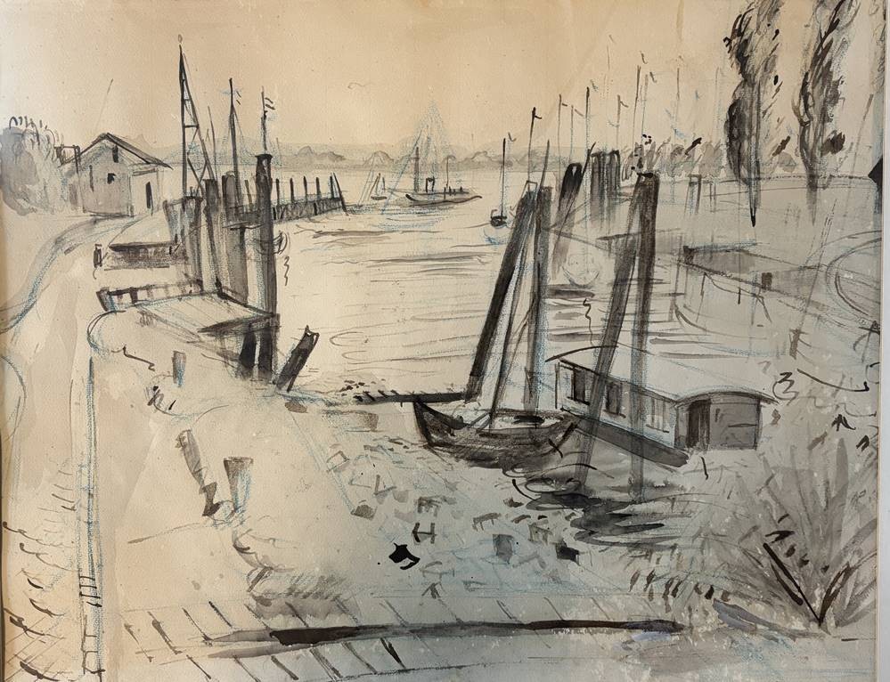 Hafensze, Sepiazeichnung, wohl unter PP signiert, gut gerahmt, RG 58x70 cm [1]