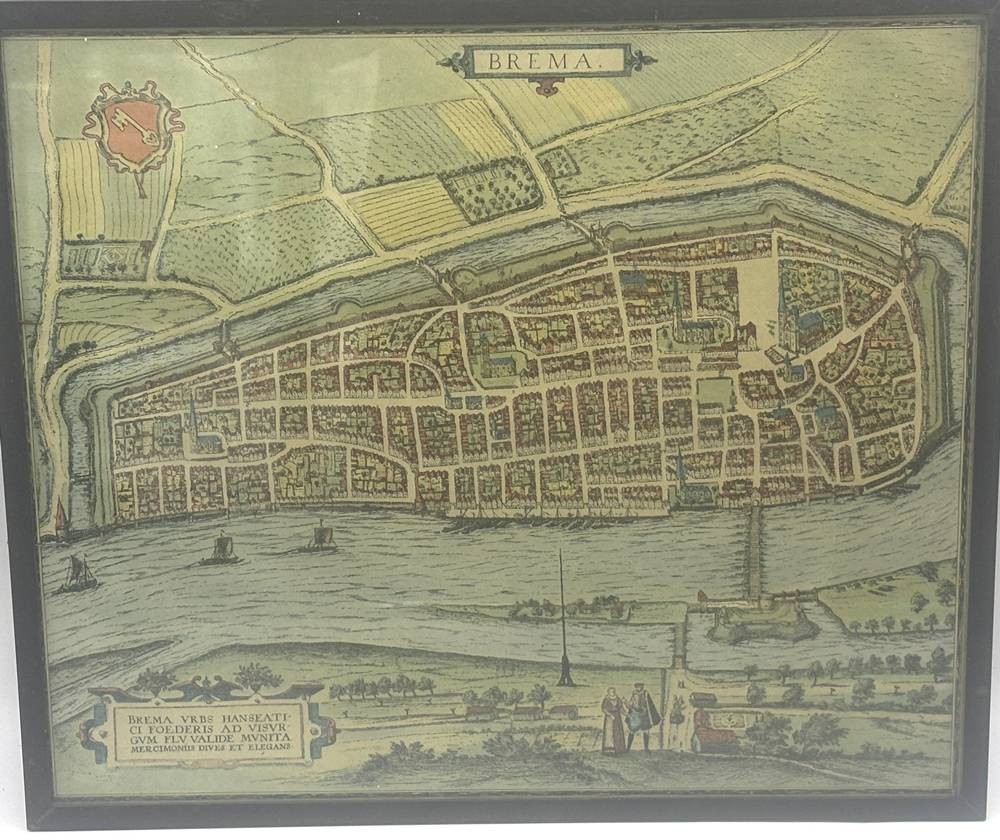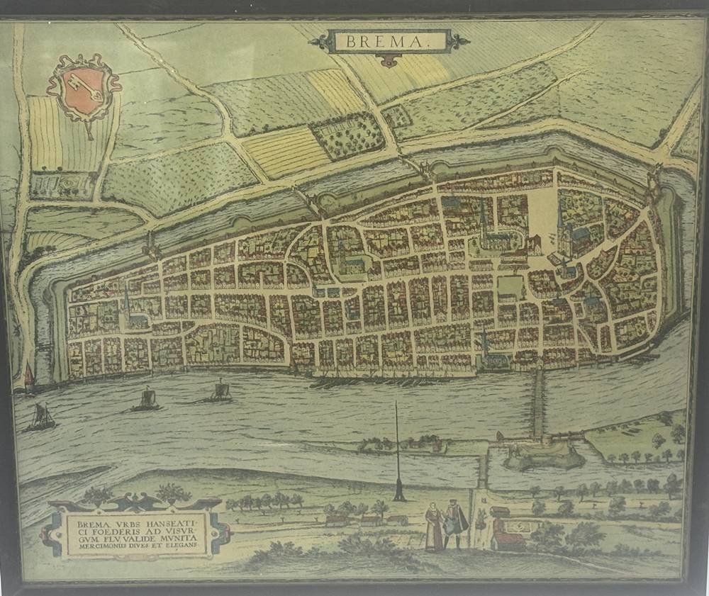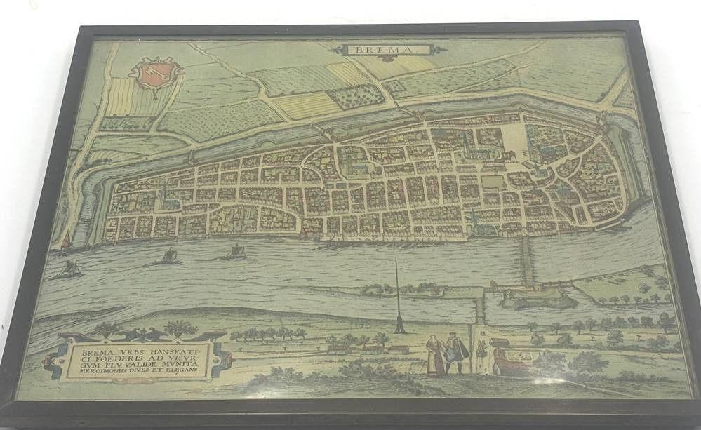 Karte von Bremen, aus "Civitates Orbis Terrarum" von Georg Braun (1541-1622) und Frans Hogenberg (1535-90) ca. 1572-1617 von Joris Hoefnagel, alt gerahmt in Messingrahmen, RG 33x38 cm, ungeöffnet, wohl Nachdruck? [1]