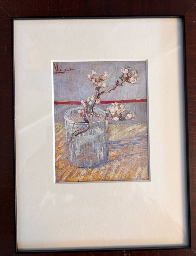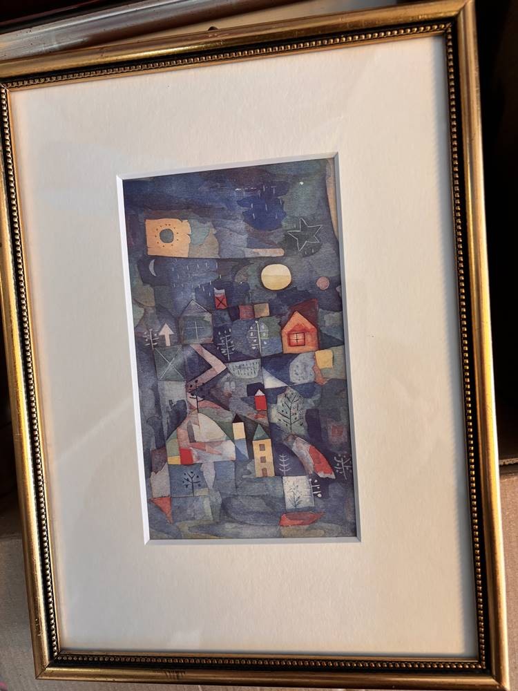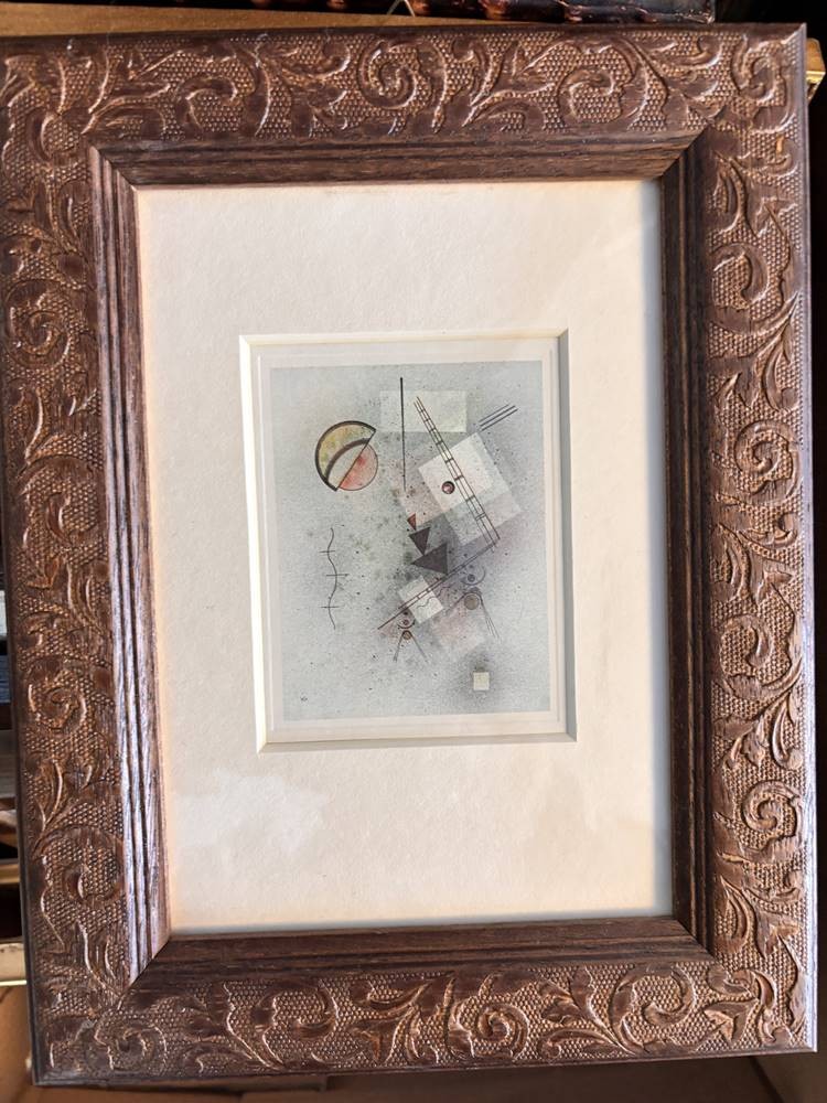 Karton mit 27 kl. Kunstdrucken nach berühmten Künstlern wie Dali, Picasso, , Kandinsky, Egon Schiele, van Gogh, Vogeler etc., alle gut gerahmt/Glas, zum Grossteil rückwärts beschrieben