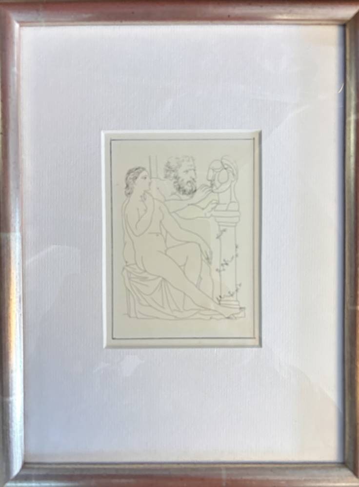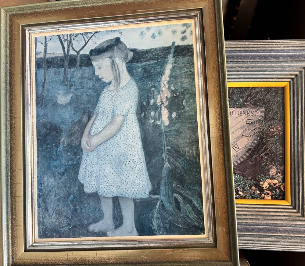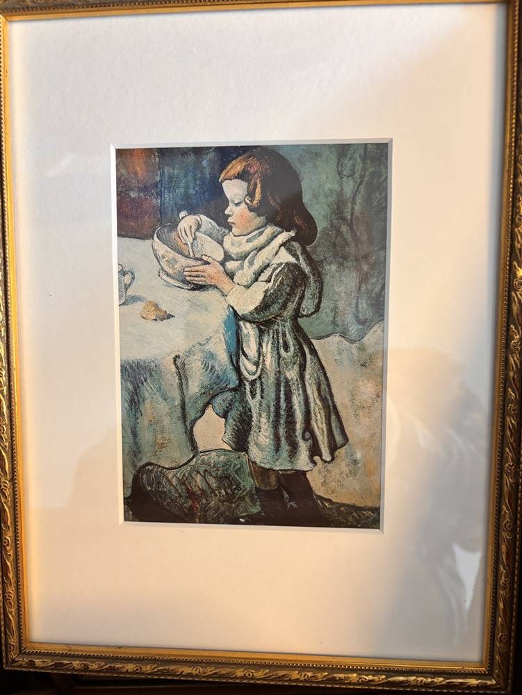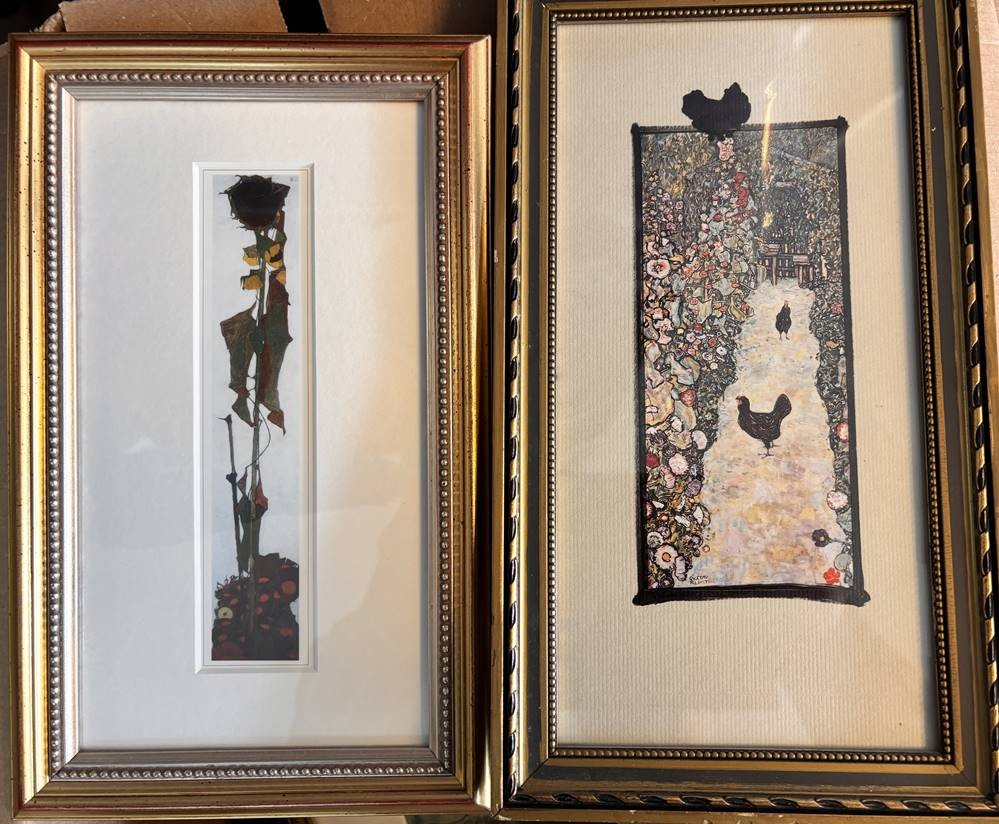 Karton mit 27 kl. Kunstdrucken nach berühmten Künstlern wie Dali, Picasso, , Kandinsky, Egon Schiele, van Gogh, Vogeler etc., alle gut gerahmt/Glas, zum Grossteil rückwärts beschrieben [1]