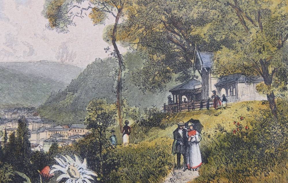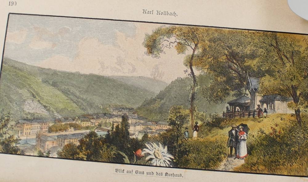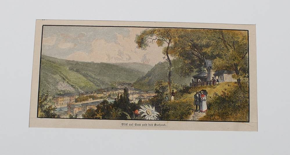 kl. Stich, Blick auf Ems und das Kurhaus, coloriert, ungerahmt in Passepartout, BG 11 x 19cm [1]