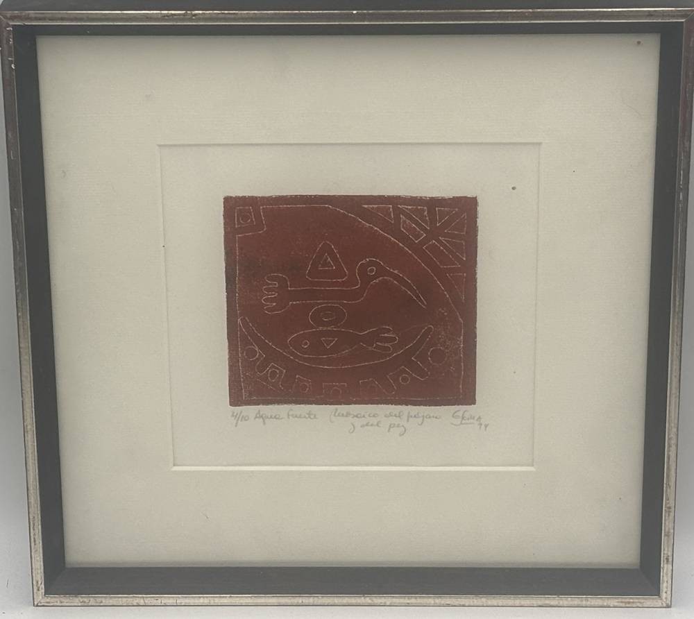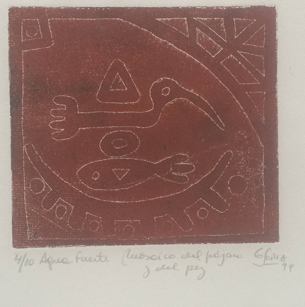 Linolschnitt oder Holzschnitt, der ein stilisiertes Vogel- und Fischmotiv darstellt „Mosaico del pajaro y del pez“ (Mosaik des Vogels und des Fisches)., sign. Gfer, 1974, ger/Glas, 30x32 cm [1]