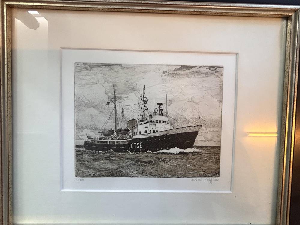 Michael Wollf, 2002 (1946) "Lotsenboot orig. Radierung, Nr. 1/100, ger/Glas, RG 30x36 cm [1]