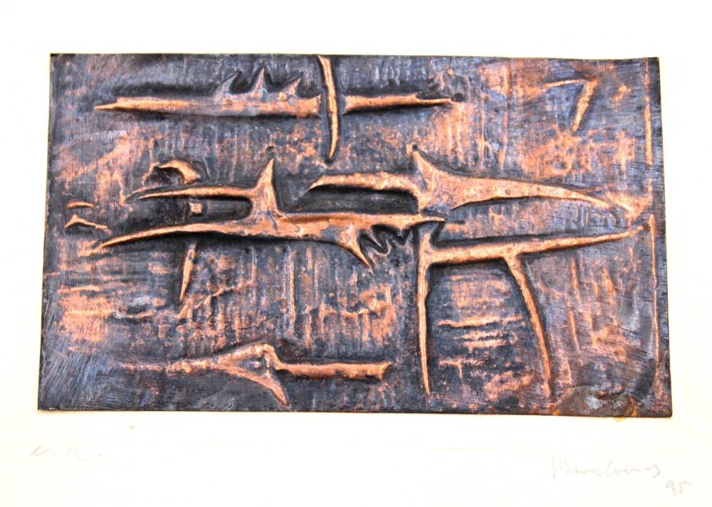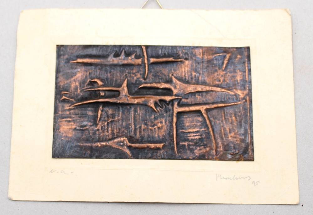 modernes kl. Kupferrelief, unleserl. signiert, verso schwer lesbar betitetl "after for the flood" o.ä., ungerahmt auf Pappe, ca. 11 x 16cm