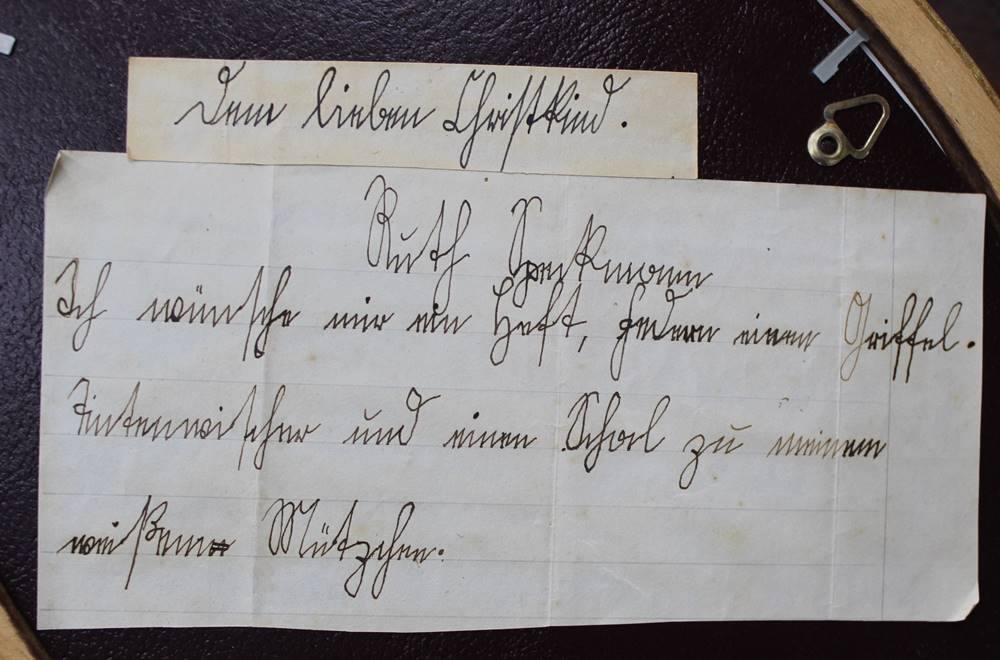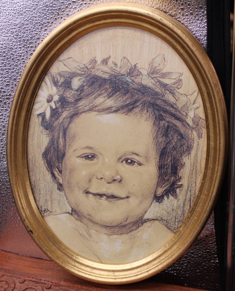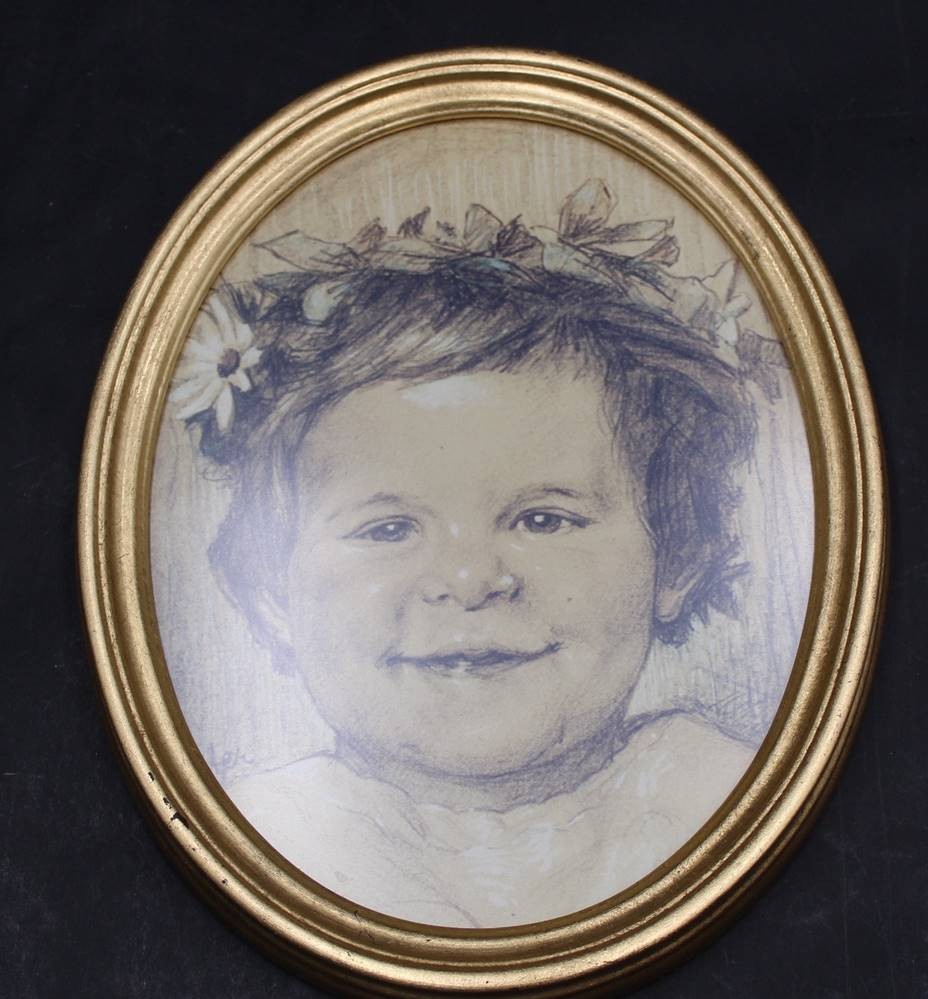 ovales anonymes Kinderportrait, gehöhte Zeichnung, verso beschriftet, 26x23 cm, 19.Jhd. [1]