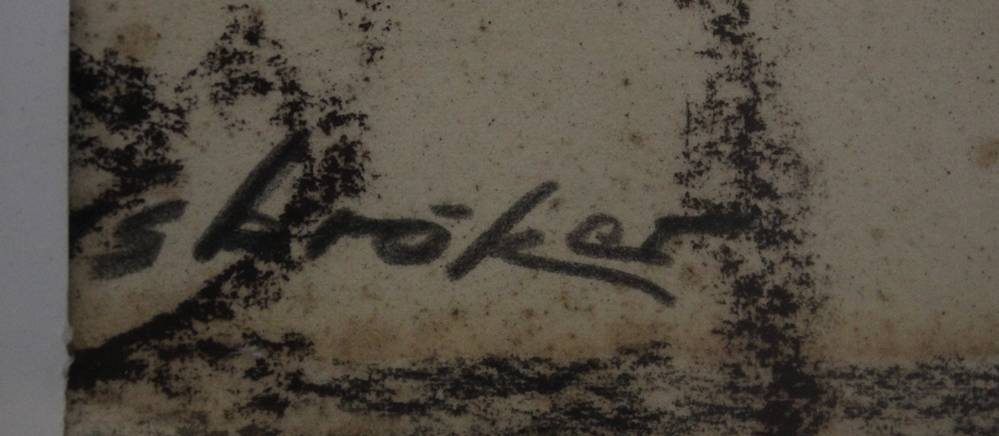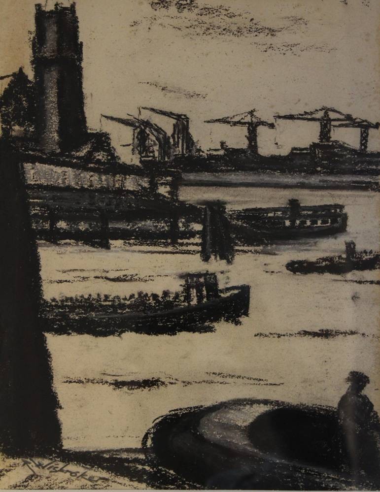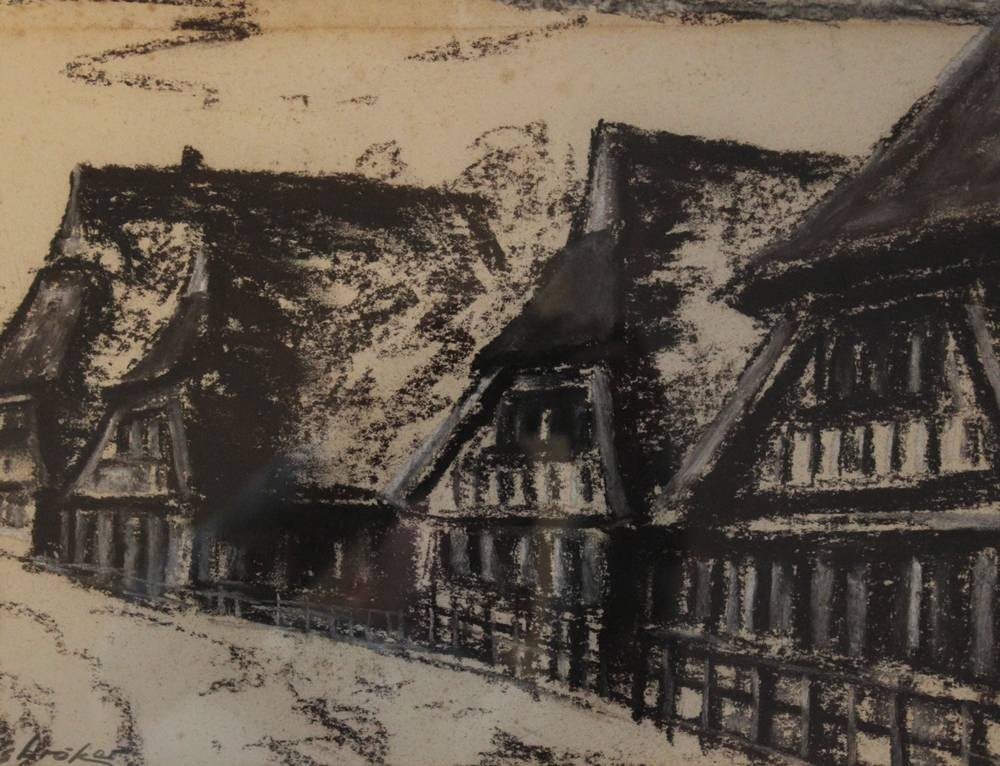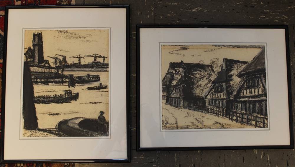 R.Wisbröker, 2x wohl Kohelzeichnungen, Hafen und Dorfansicht, je gerahmt/Glas, RG 41 x 51cm [1]