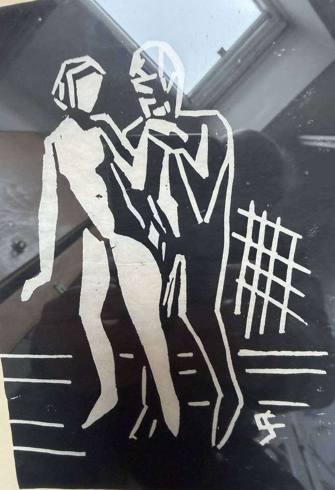 unleserl. (Seppl Grossmichl?) 1952, 2 Figuren, Linolschnitt, ger/Glas, RG 27x20 cm [1]