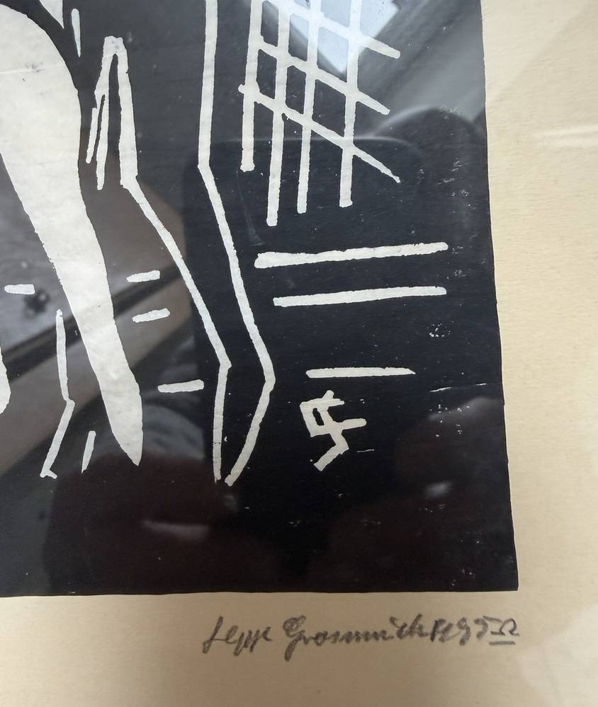 unleserl. (Seppl Grossmichl?) 1952, 2 Figuren, Linolschnitt, ger/Glas, RG 27x20 cm