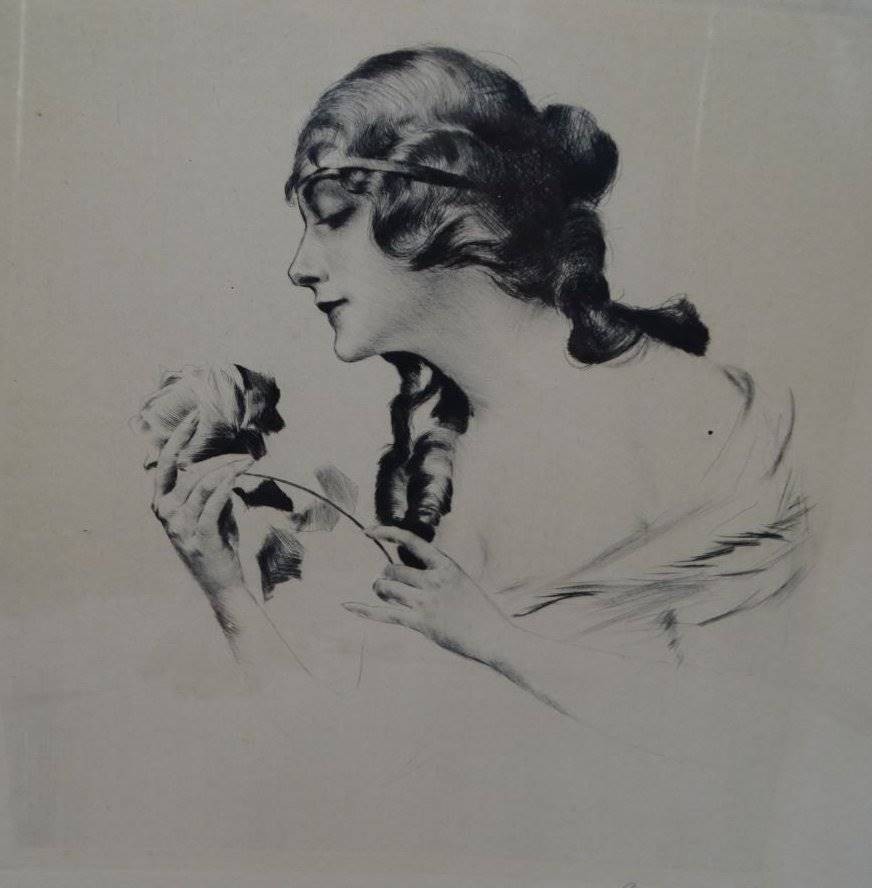 unleserl. sign. Radierung "Mädchen mit Rose"m BG ca. 37x33 cm