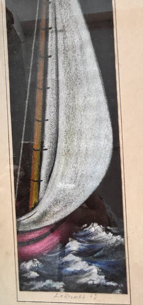 unleserl. signiert, 1969 "Segelyacht im Wind" Mischtechnik, hinter Glas, 50x17 cm [1]