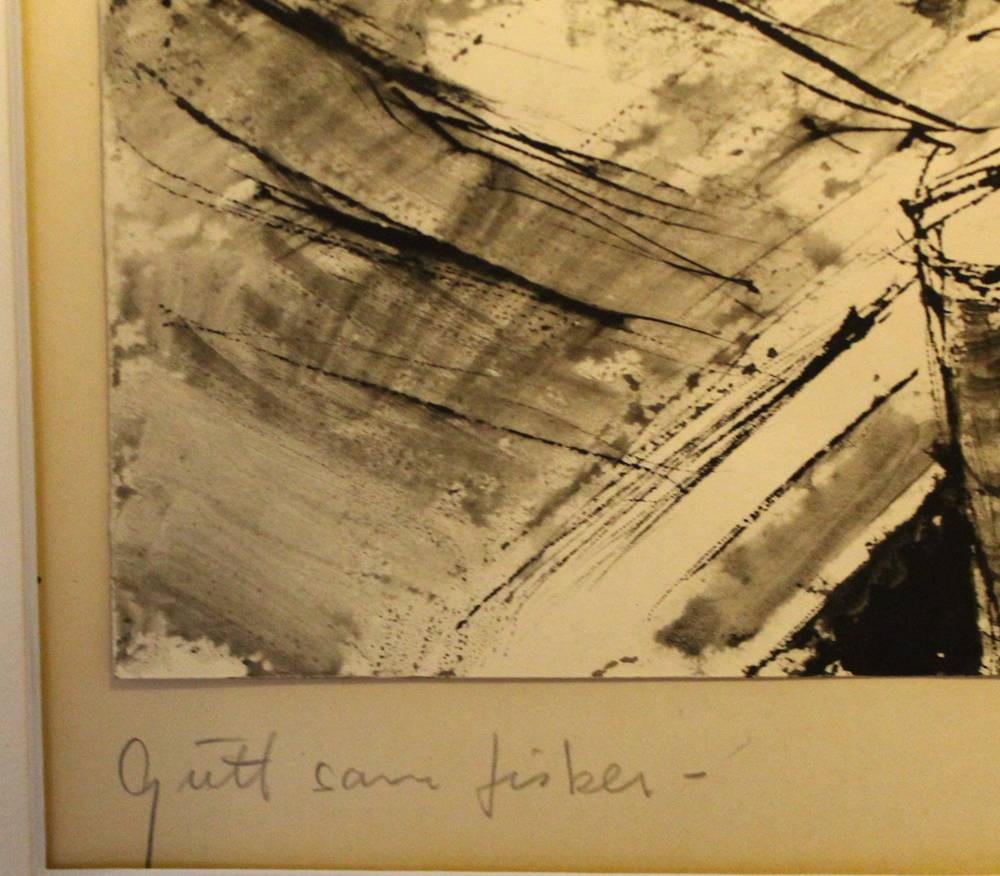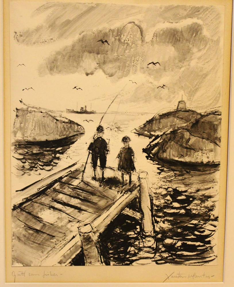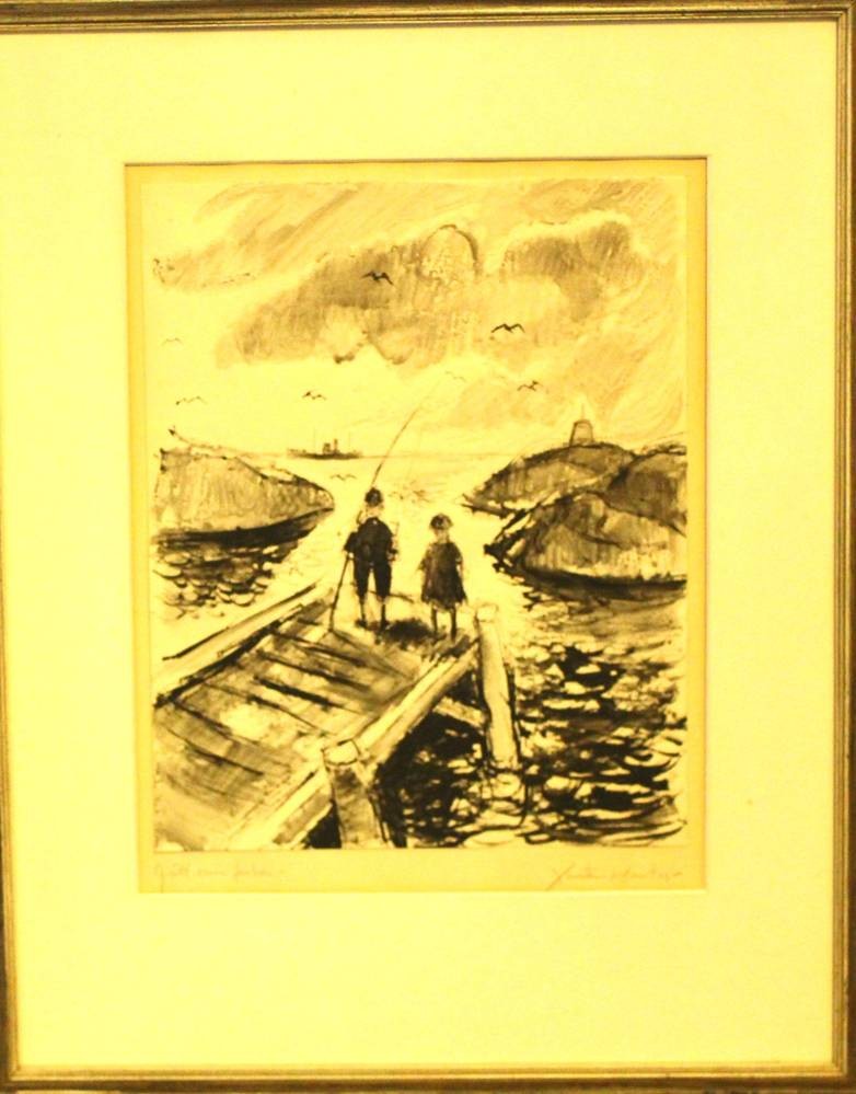 unleserl. signiert, Kinder beim Fischen, wohl Skandinavien, Lithographie, gerahmt, RG 65x54 cm [1]