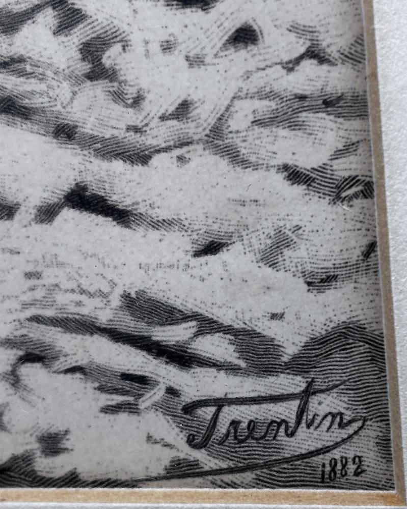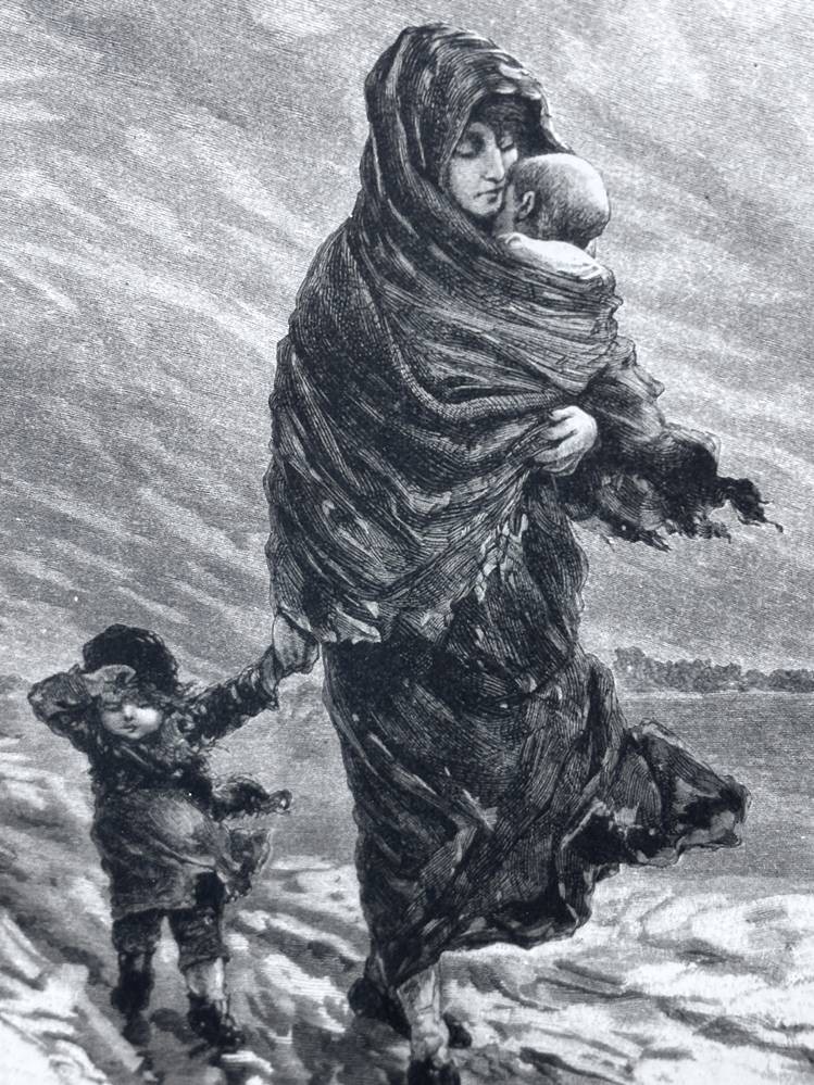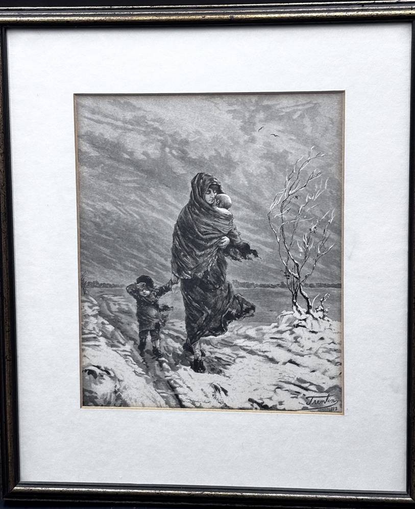 unleserl. signierte Radierung 1882, Mutter mit Kindern im Wintersturm, ger/Glas, RG 36x31 cm [1]