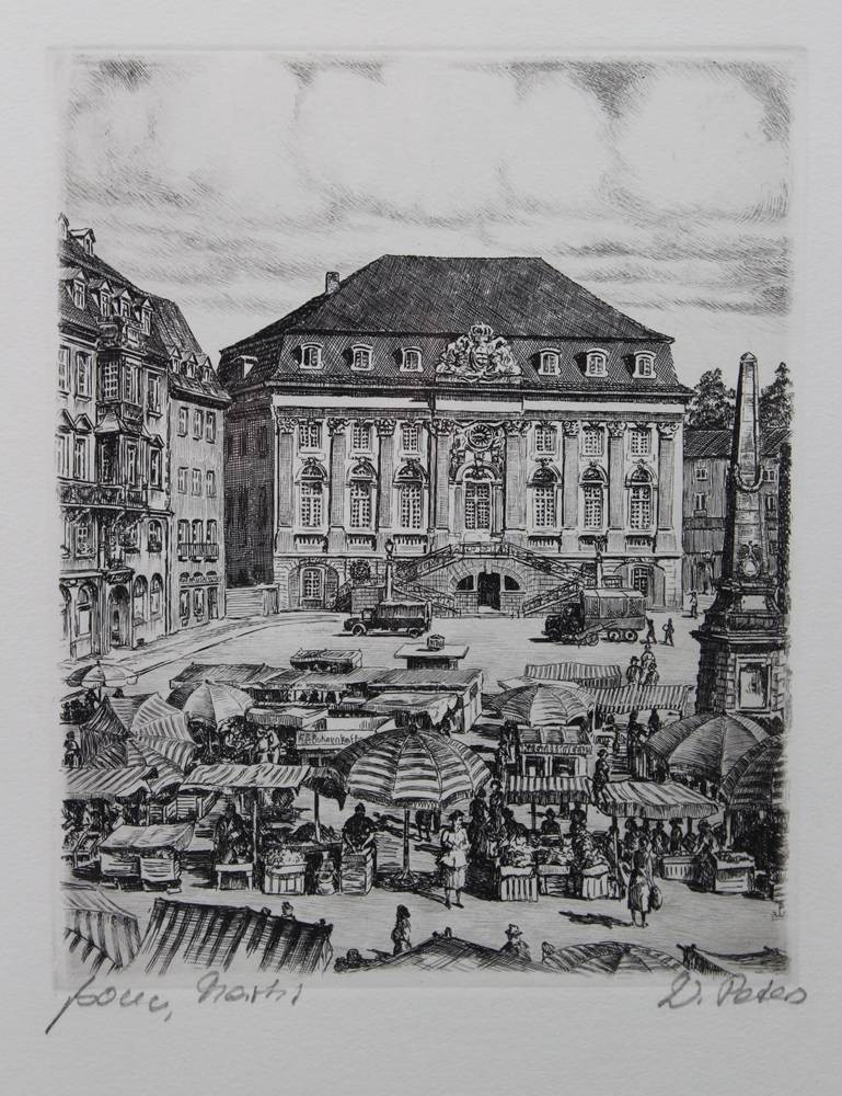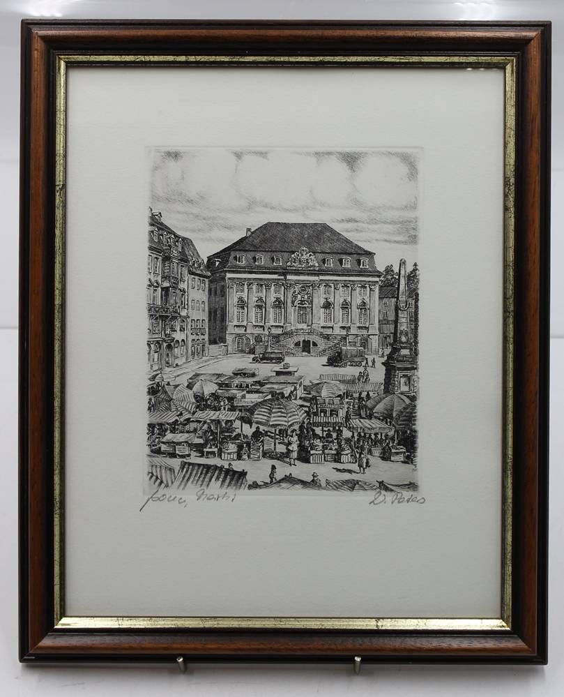 W.Peters, Rathaus und Markt in Bonn, Radierung, ger./Glas, RG 34 x 28cm [1]