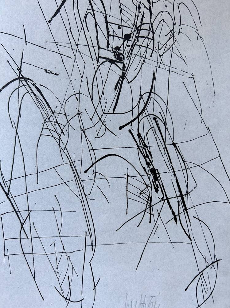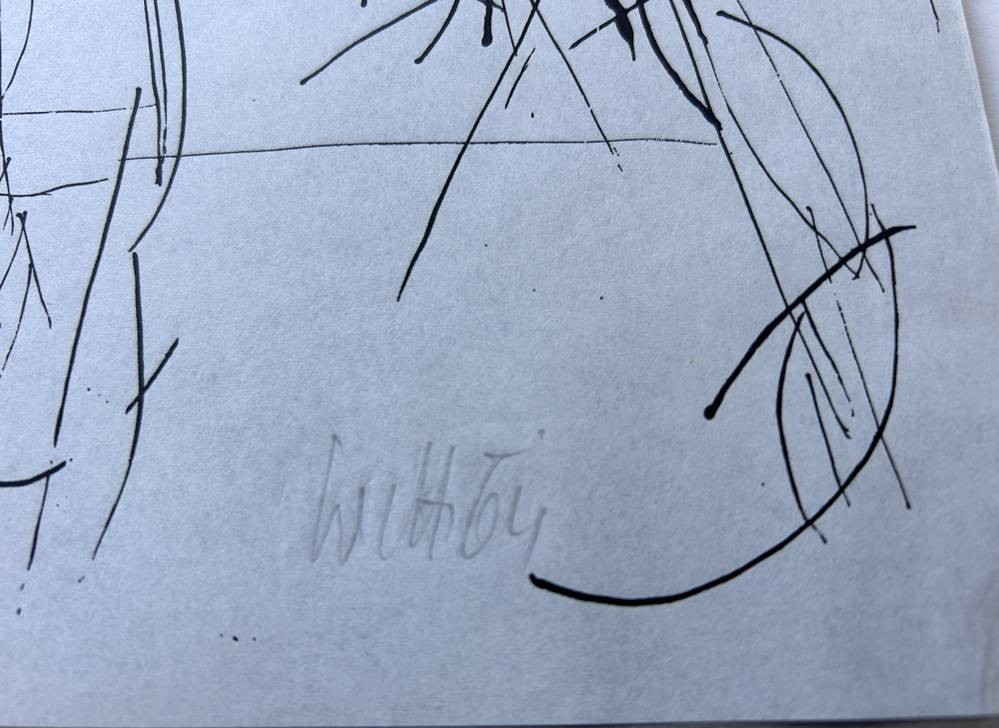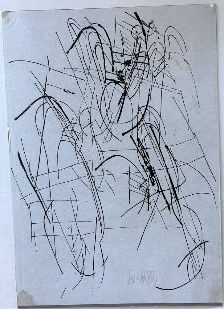 Witt, 64 sign. Federzeichnung auf Karton, ohne Titel, diese und die nächsten ca. 25 Grafiken stammen aus einem Ordner aus dem Nachlass von Hans Hermann Henseleit (* 1911 in Königsberg; † 1997) deutscher Journalist und Kunstsammler.s. Henseleit Stiftung in KIel, einige Blätter auch mit persönl. Widmung an ihn, MG 31x21 cm [1]