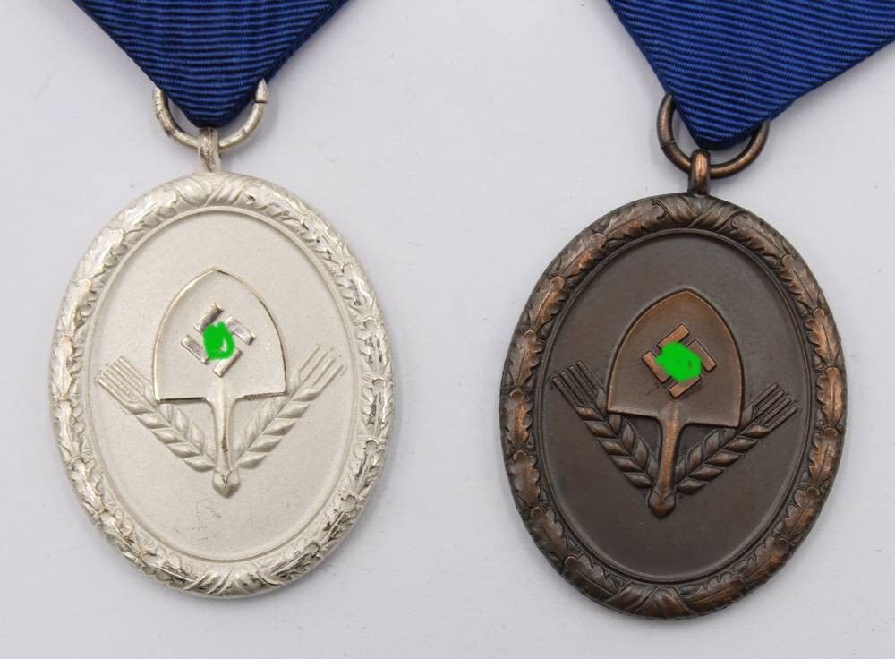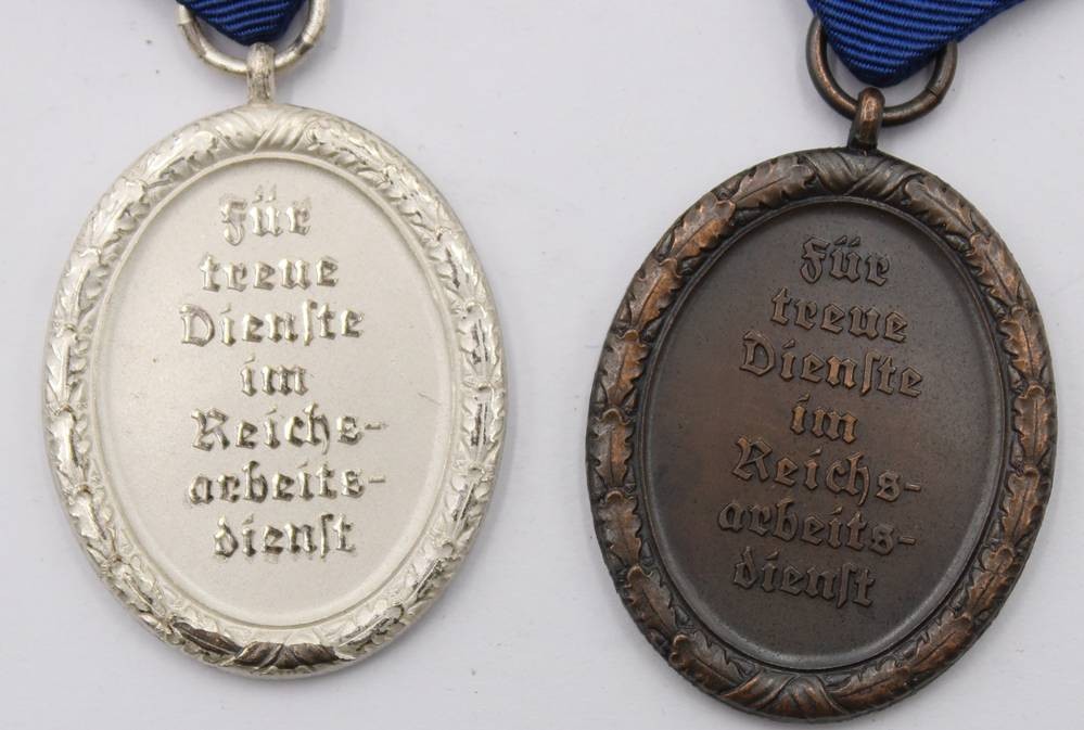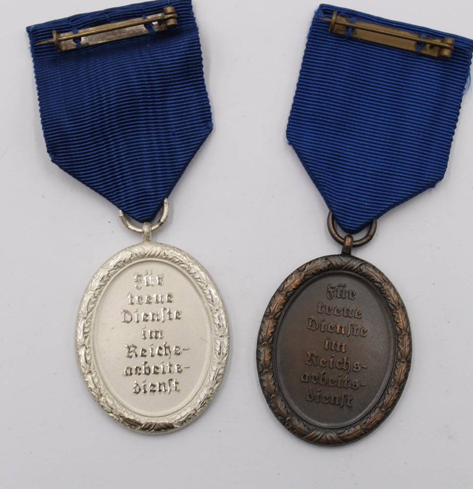 2x Treueabzeichen, Bronze und Silber im Reichsarbeitsdienst am Band