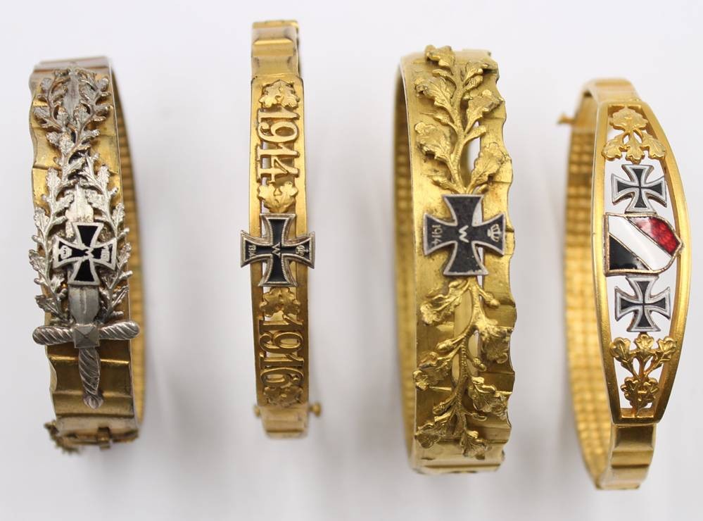 4x patriotische Armreifen aus Granaten-Messing, alle 1914-18, 2x signiert