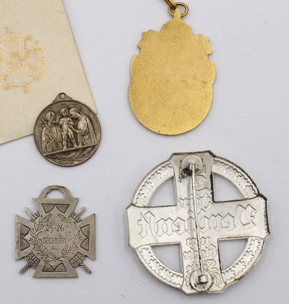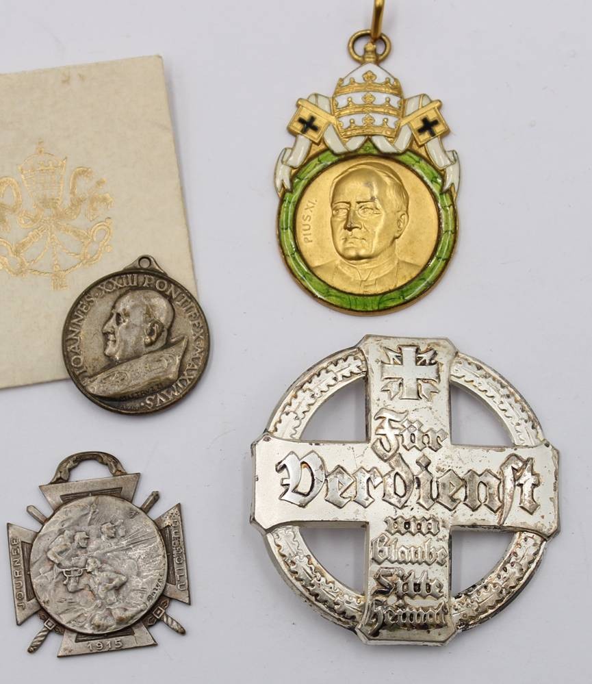 4xAbzeichen, Medaillen.. Silbernes Verdienstkreuz Bund der Historischen Deutschen Schützenbruderschaften e.V., "Für Verdienst um Glaube, Sitte, Heimat, 835 SILBER punziert. Päpstliche Medaille Johannes XXIII in orig. Papierhülle, 1x kathol. Andachtsmedaille Papst Pius X, und Frankreich, Journée du poilu, Kriegs-Medaille, 1915, [1]
