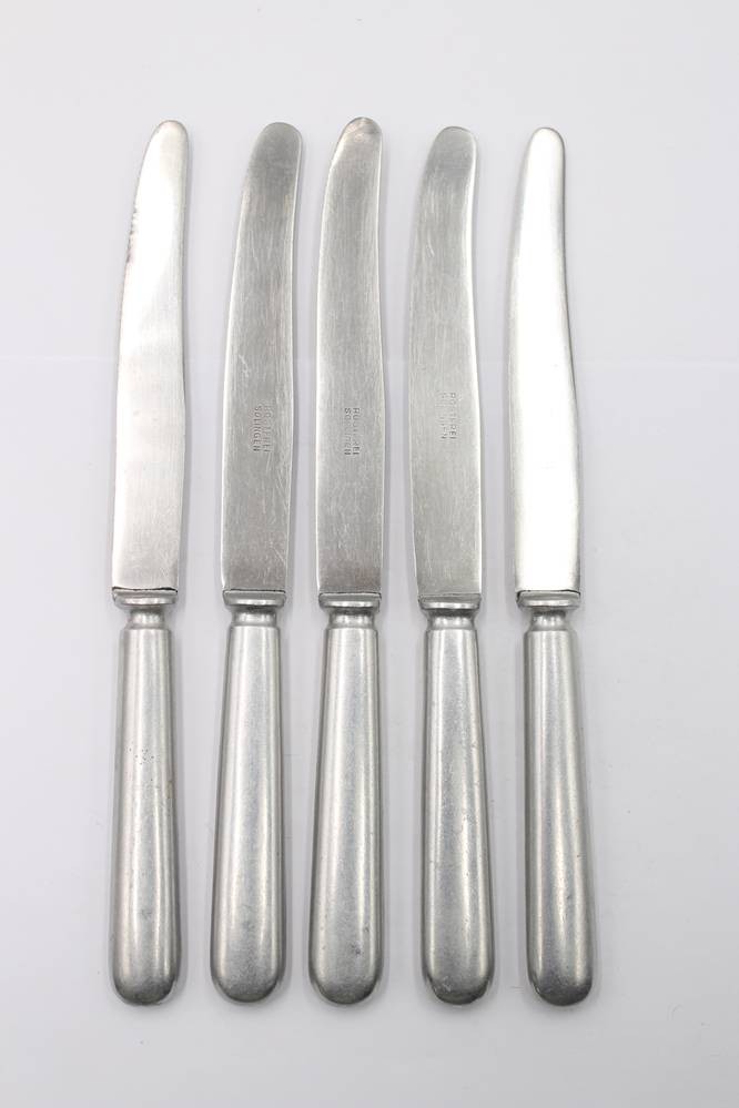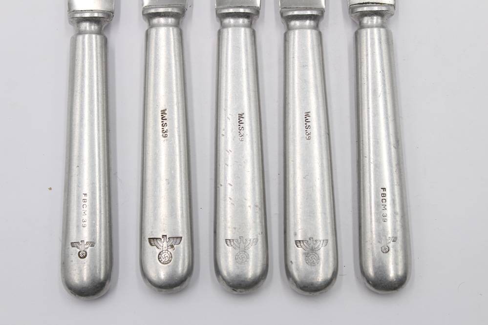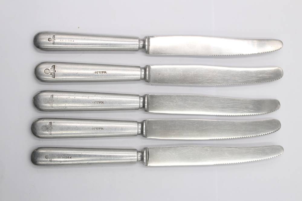 5 Messer, Luftwaffe-Kantinenbesteck mit Hoheitsadler, Hersteller Wilhelm Jordan, Solingen, 1913,Griffe Aluminium, L-ca. 24 cm [1]