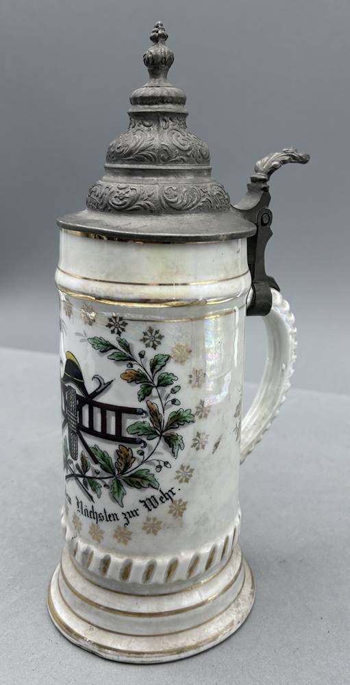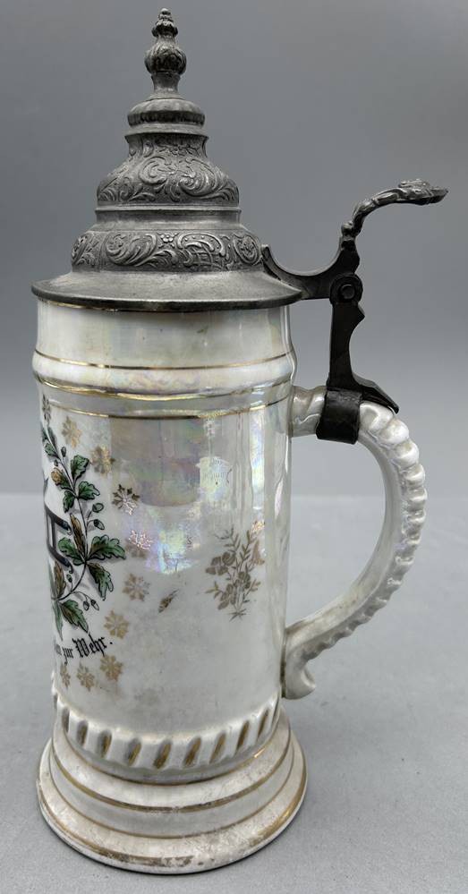 alter Feuerwehr-Krug mit gravierten Zinndeckel, in Boden Lithophanie, gut erhalten, wohl um 1920, H-27 cm [1]