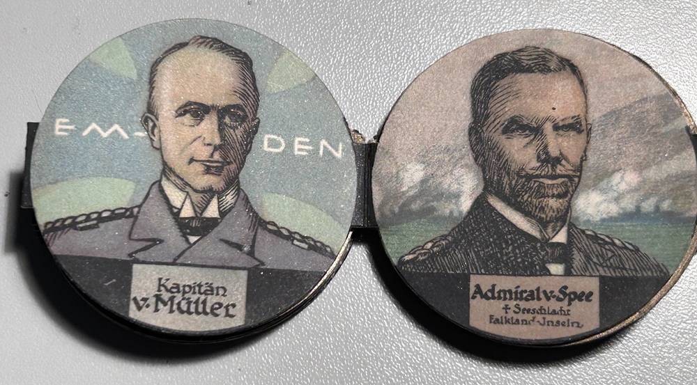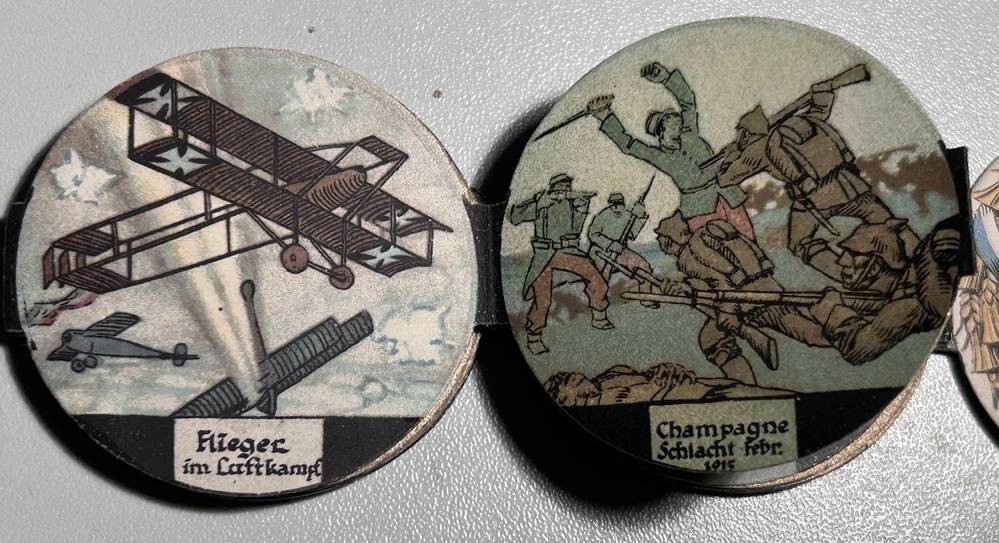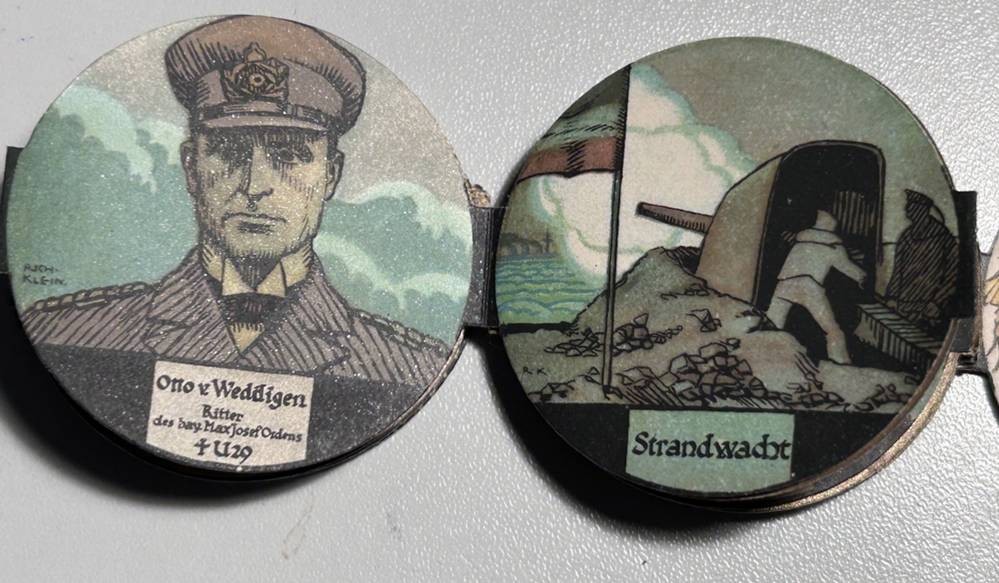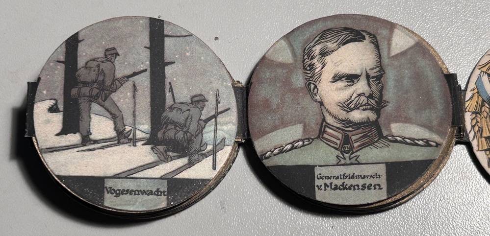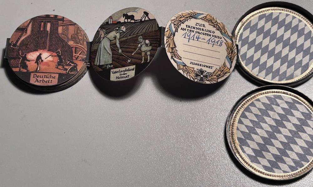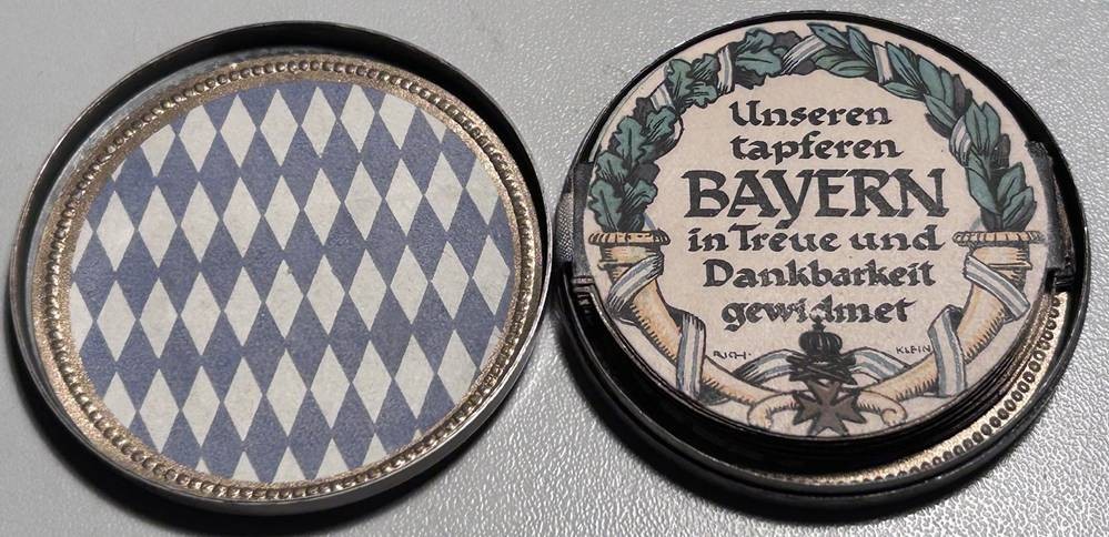 Bayernthaler 1914-16, Deckeldose mit Königsportrait, innen Leporello mit Kriegsbildern, Generälen etc. des 1.WK, in orig. Schachtel, zugunsten der Gefallenen und Kriegerwitwen, gut erhalten und selten in diesem Zustand, Schachtel ca. 6x6 cm