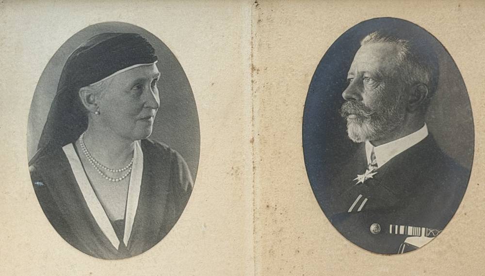 Foto von Prinz Heinrich und seiner Frau, Bruder von Kaiser Wilhelm II, rückseitig Danksagung an Herrn Vizeadmiral a.D. Meurer anlässlich seiner Verabschiedung nach 40 Jahren Tätigkeit