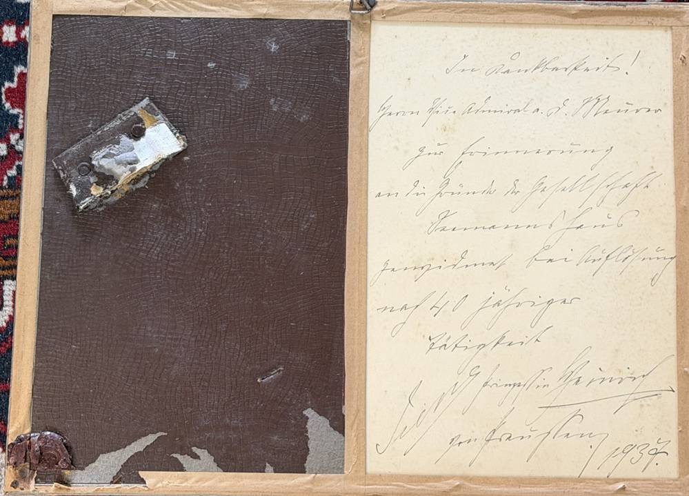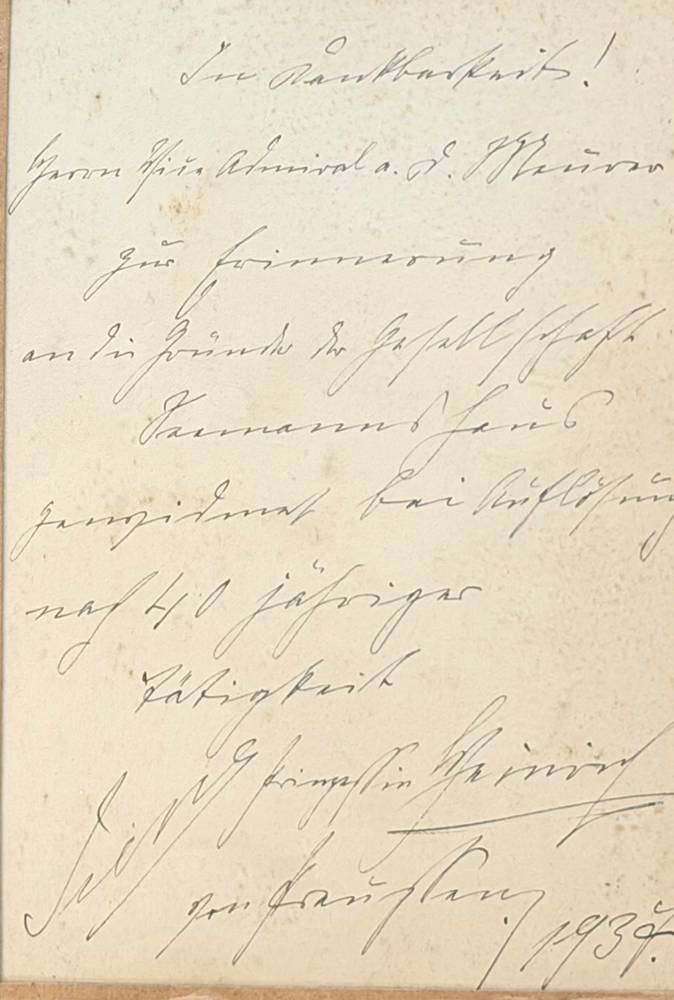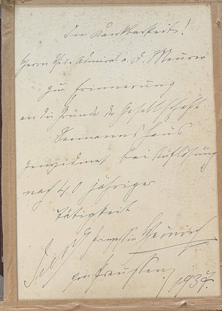 Foto von Prinz Heinrich und seiner Frau, Bruder von Kaiser Wilhelm II, rückseitig Danksagung an Herrn Vizeadmiral a.D. Meurer anlässlich seiner Verabschiedung nach 40 Jahren Tätigkeit [1]