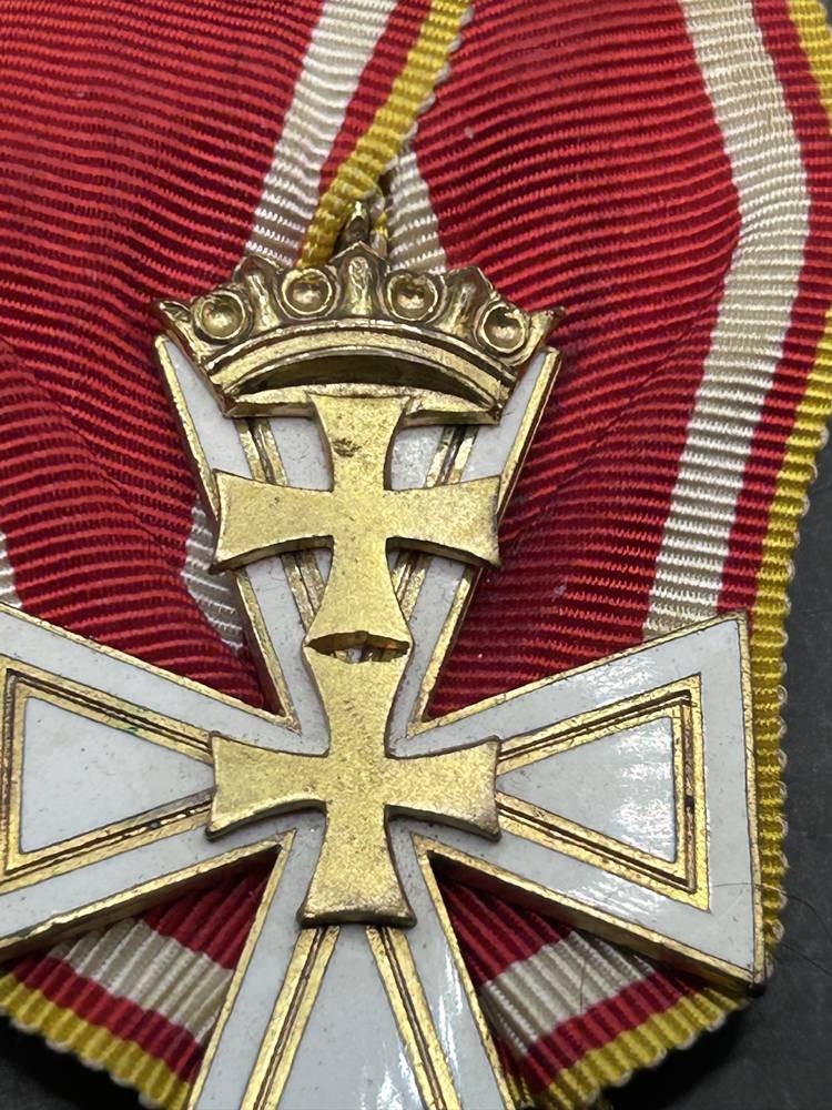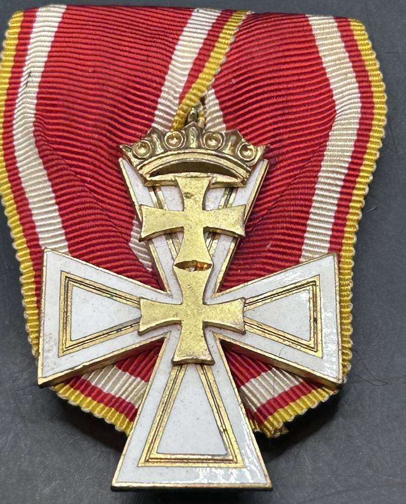 Freie Stadt Danzig : Danzig Kreuz, 2. Klasse. Buntmetall vergoldet, teilweise emailliert , die Auflage zweifach verschraubt, rückseitig vertieft die Herstellermarkierung "B.v.A. Hülse-Berlin", am Bande. Insgesamt wurden nur 272 Exemplare der 2. Klasse verliehen in 1939 bis zum 11 Dezember, 47,5 mm × 35 mm und war im gesamten Reich als staatliche Auszeichnung anerkannt