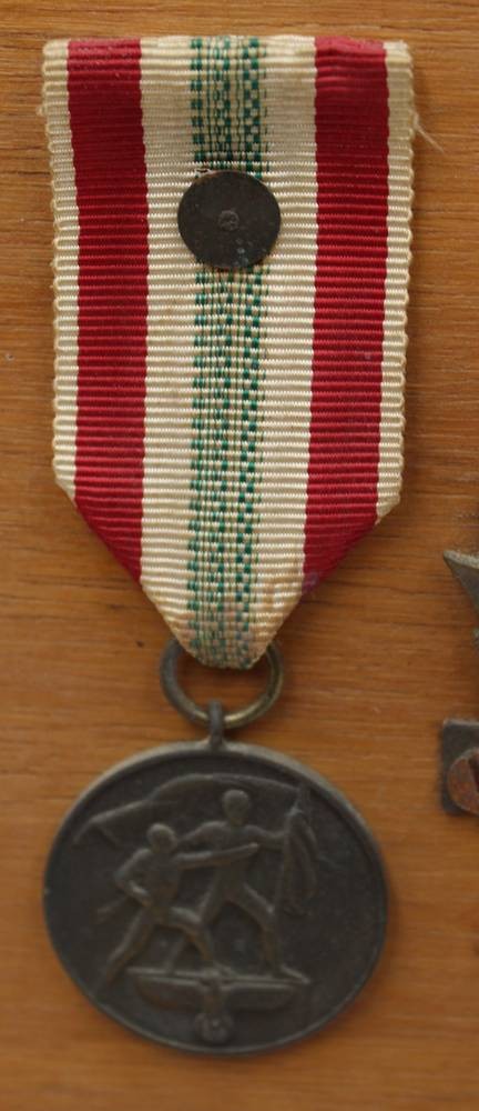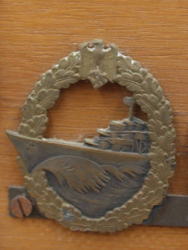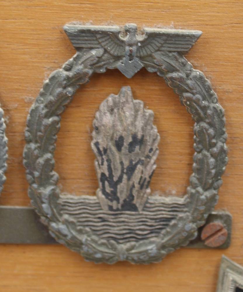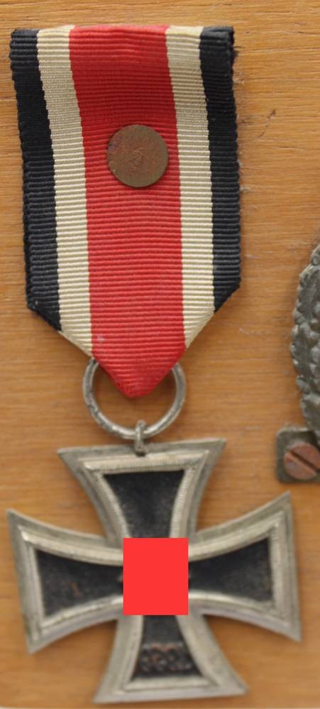 Holzbrett mit 5 div. Orden aus dem 3. Reich, Eisernes Kreuz 2 kl. (magnetisch), Medaille, sowie 3 MArine-Orden je angelötet, Nadelsysteme fehlen, Altersspuren [1]