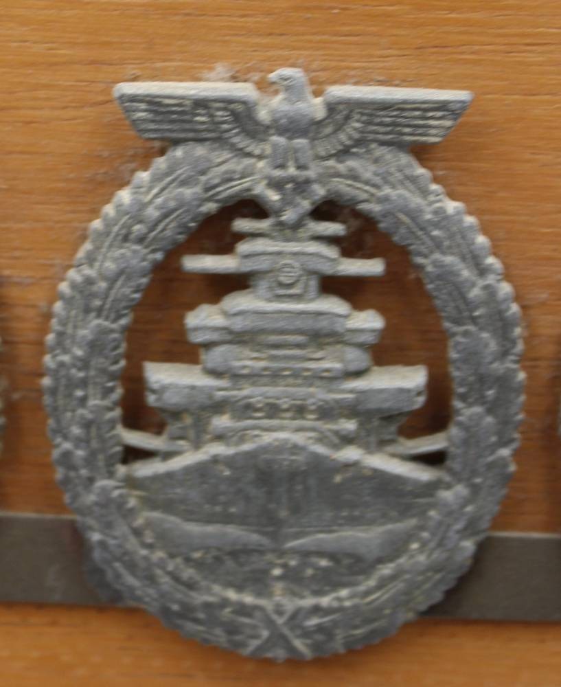 Holzbrett mit 5 div. Orden aus dem 3. Reich, Eisernes Kreuz 2 kl. (magnetisch), Medaille, sowie 3 MArine-Orden je angelötet, Nadelsysteme fehlen, Altersspuren