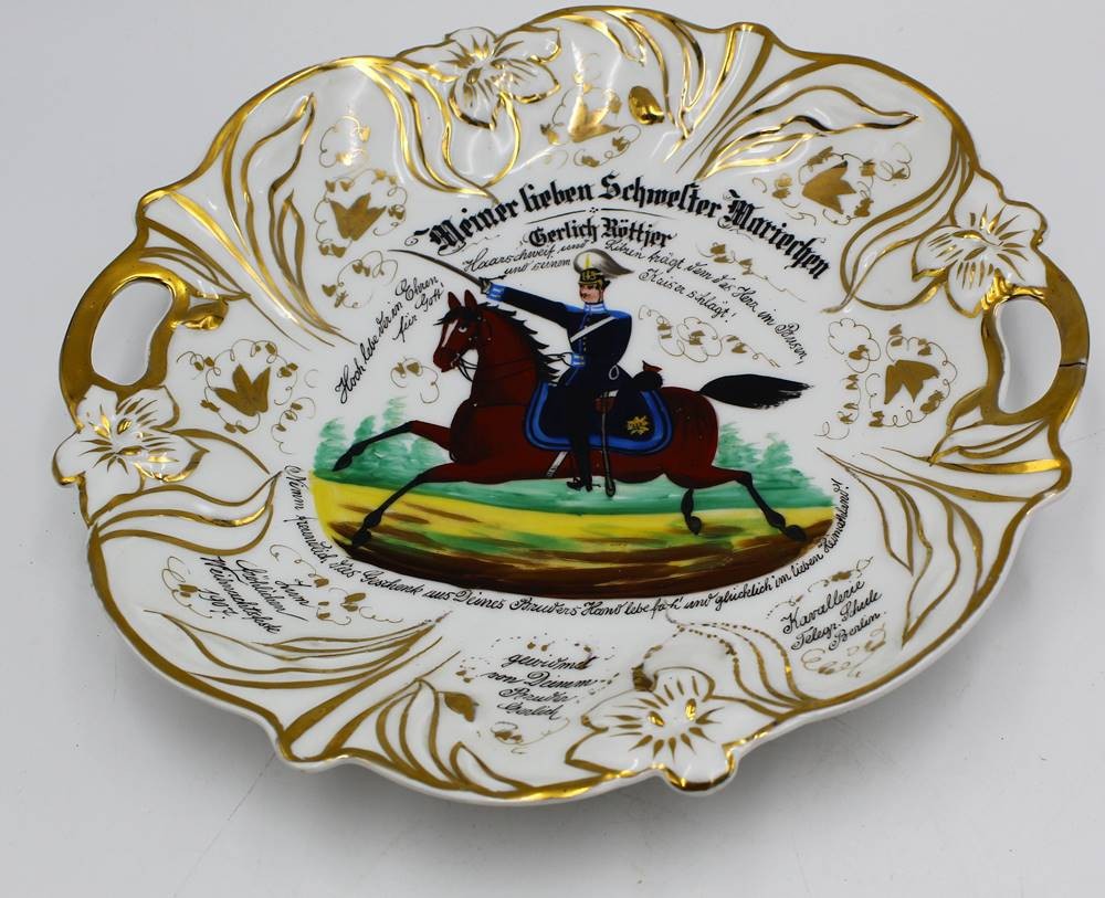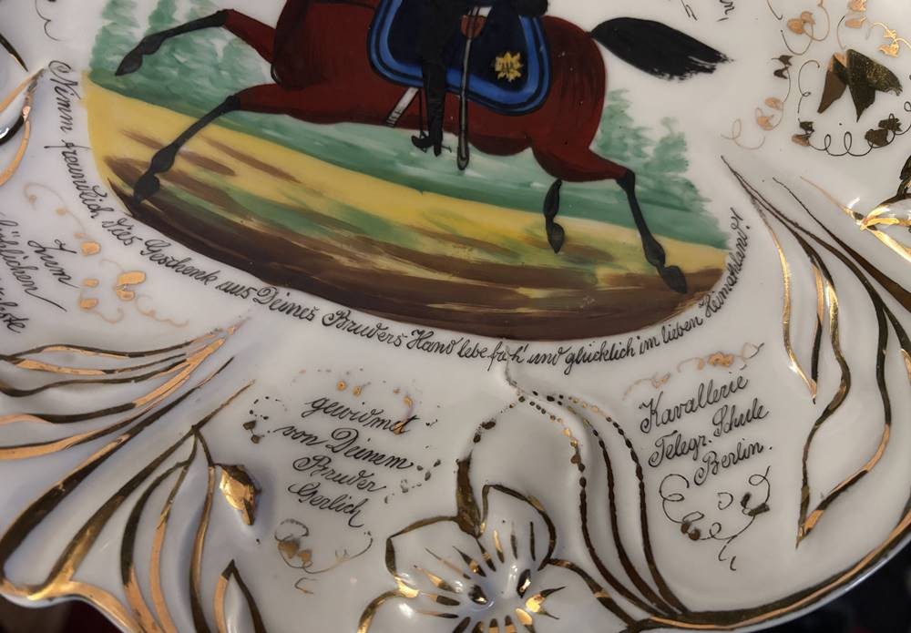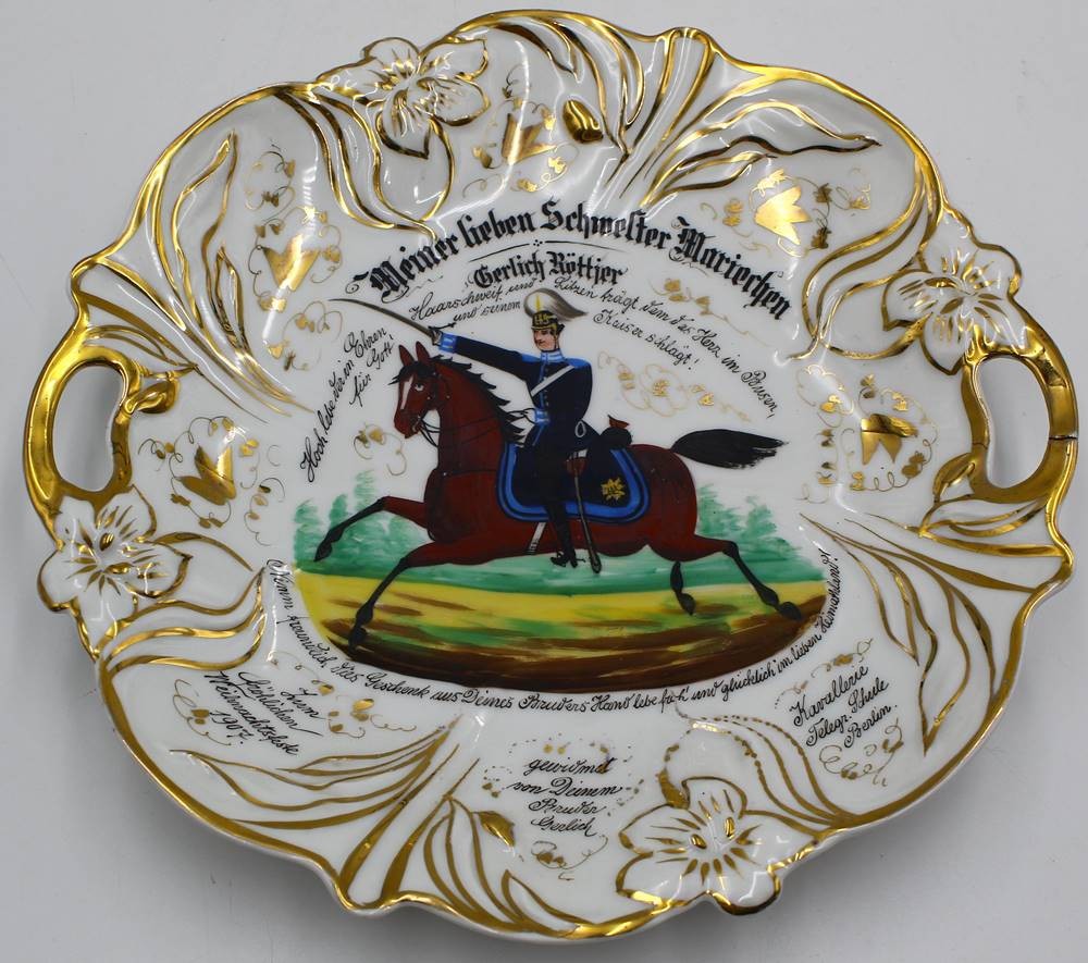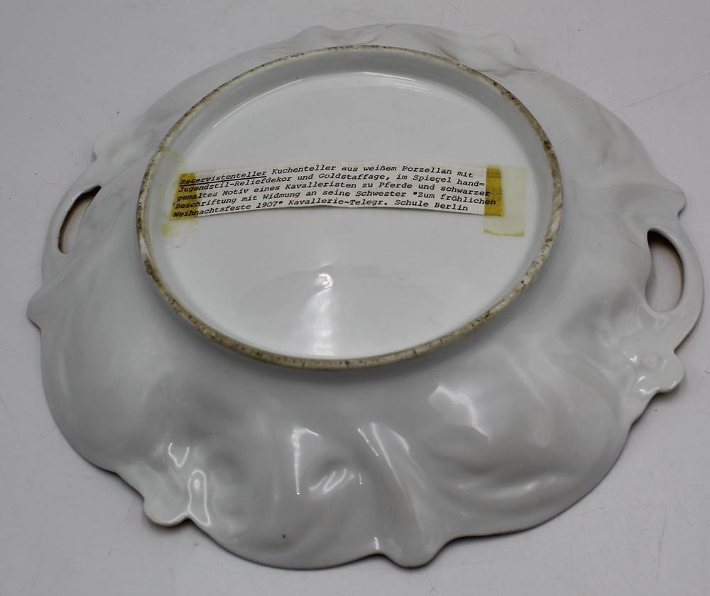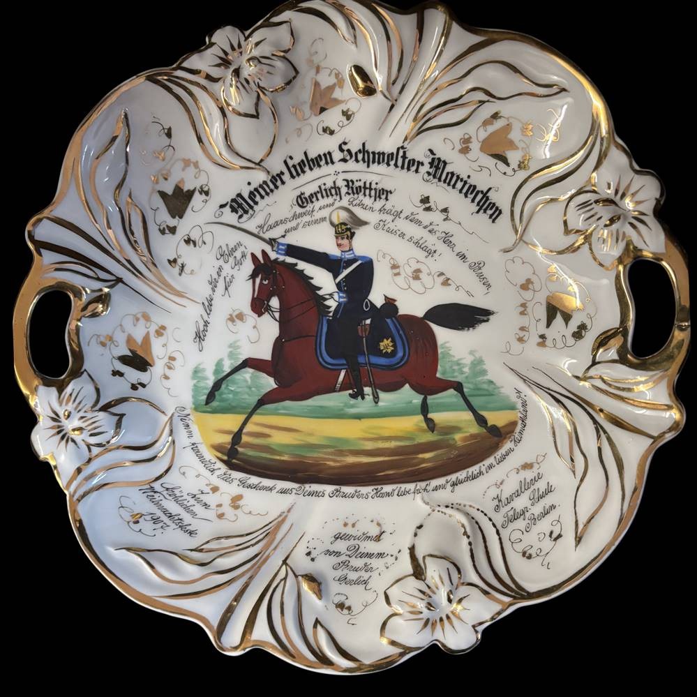 Kavaleristenteller von 1907, mit viel handschriftlichen Text, kurzer Brandriss, D-27 cm [1]