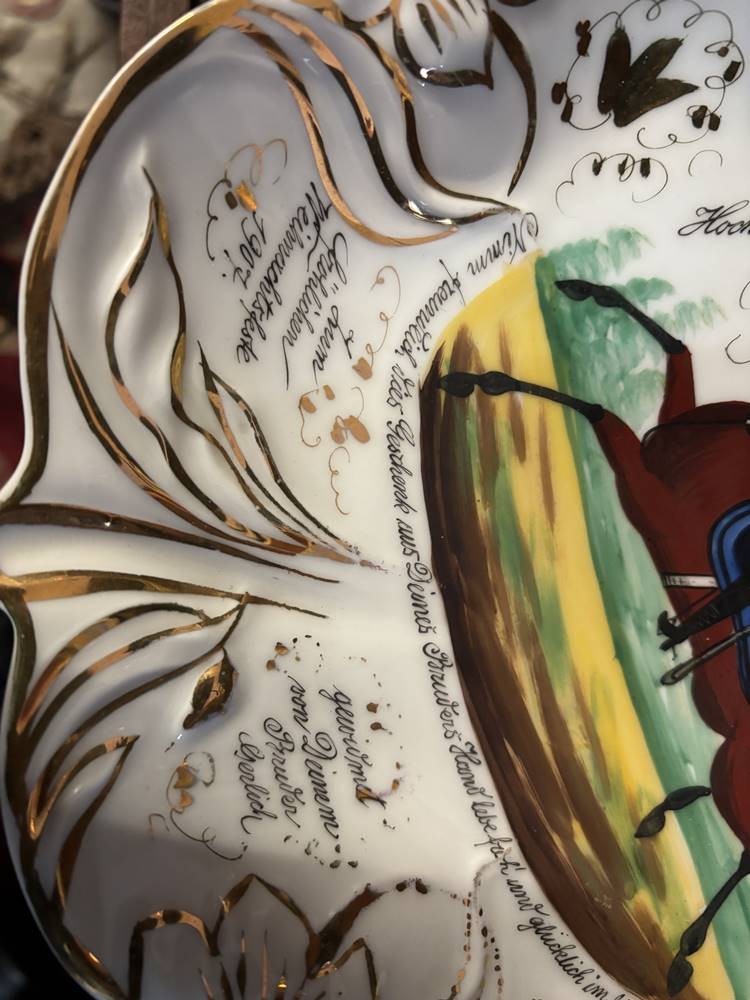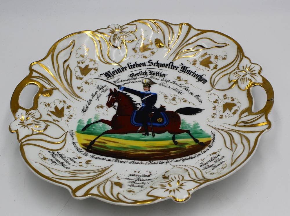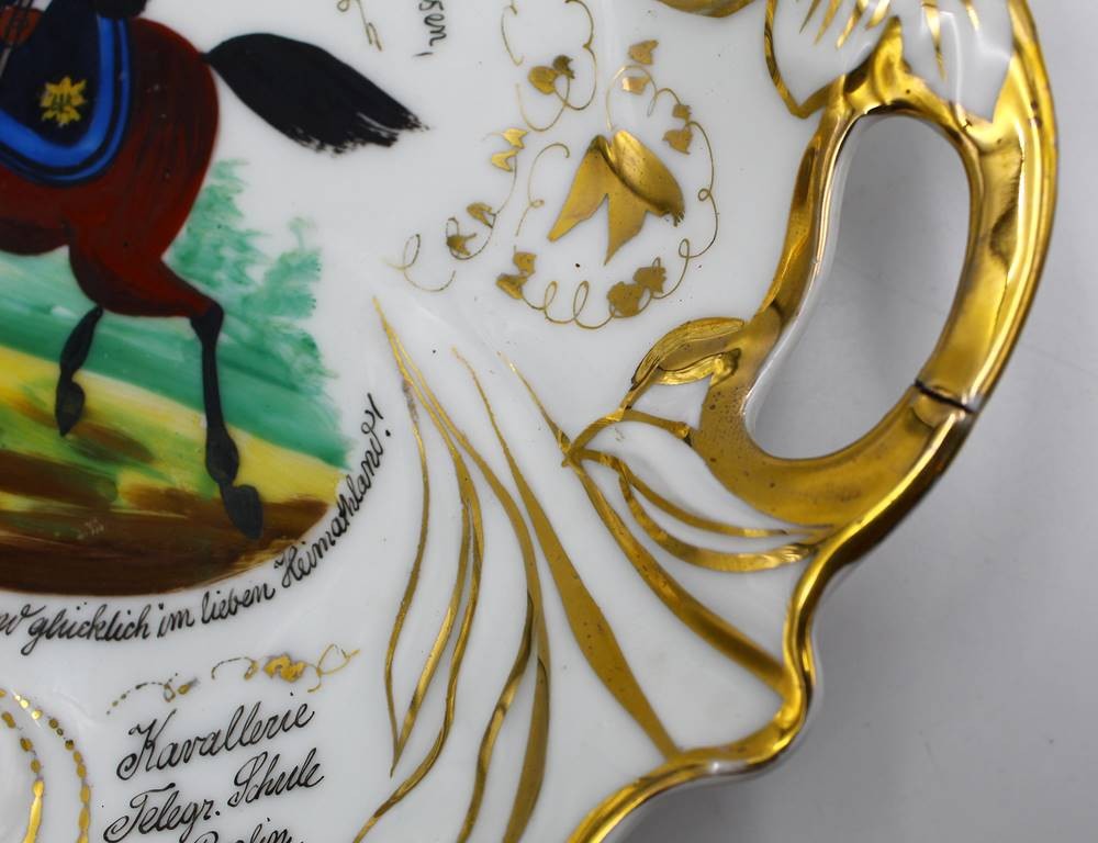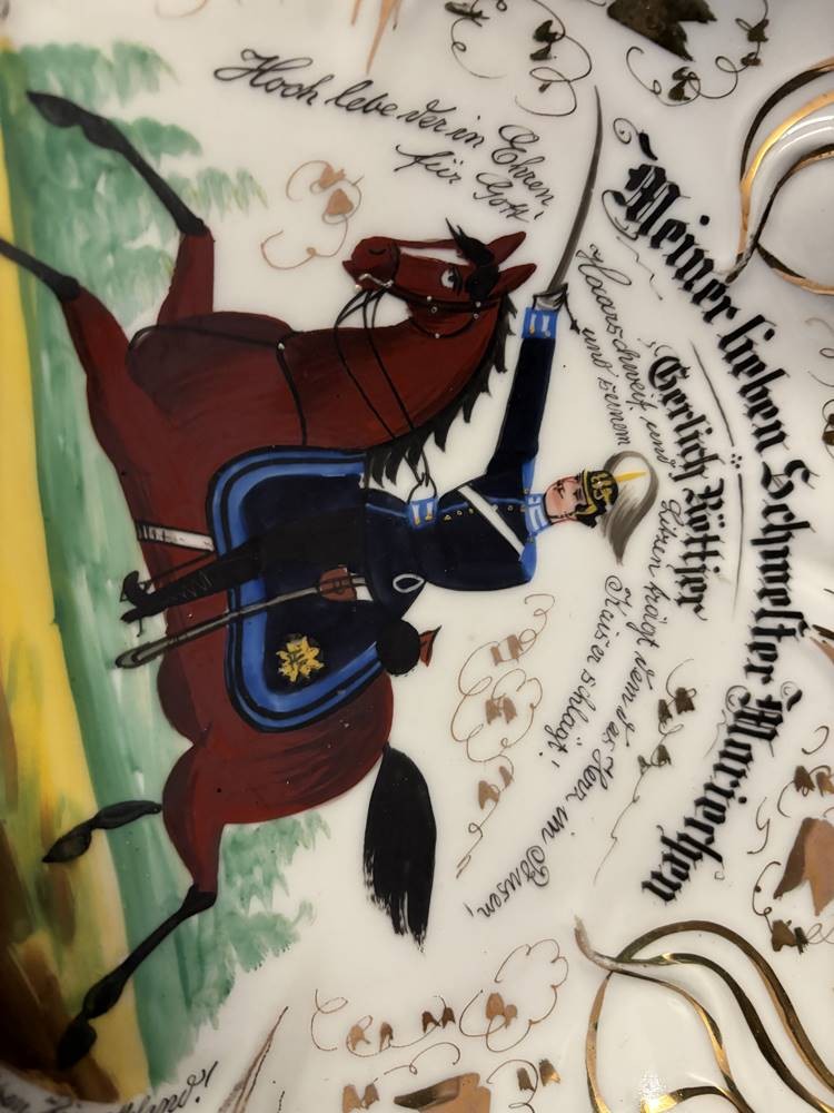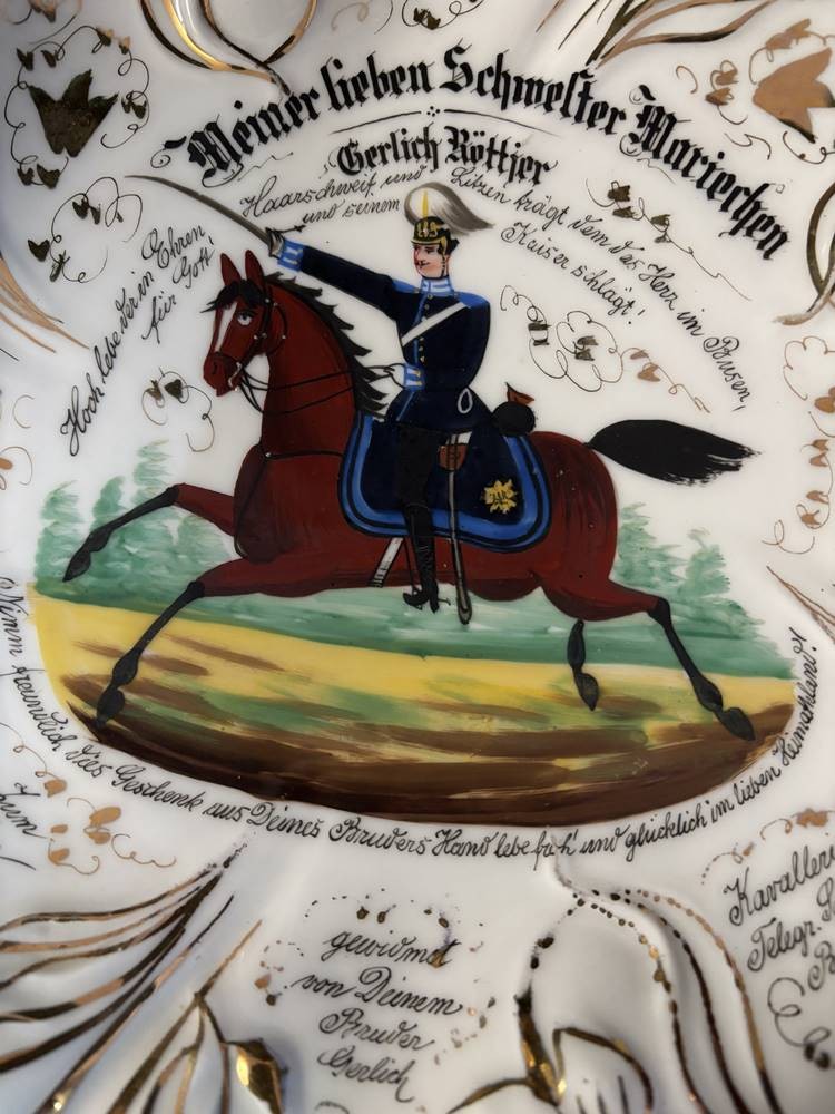 Kavaleristenteller von 1907, mit viel handschriftlichen Text, kurzer Brandriss, D-27 cm [1]