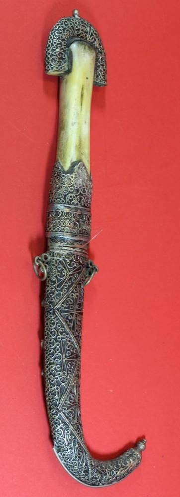 langer Krummdolch, versilberte Scheide besetzt mit Farbsteinen , L-45 cm, Beingriff oder Horn?