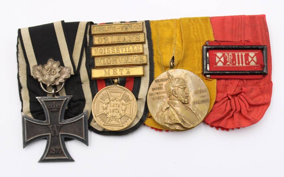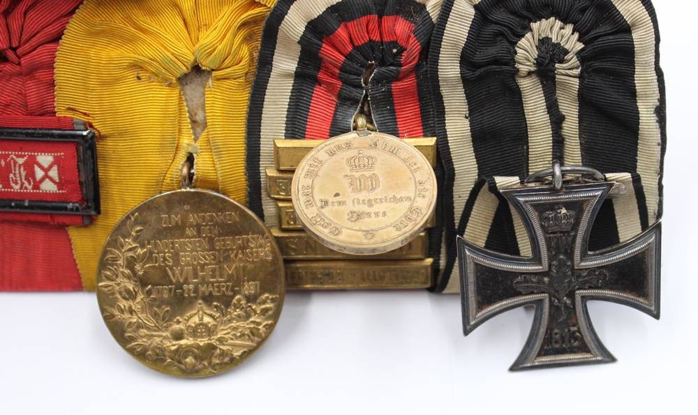 Ordenspange, 1. WK, 3 Orden u.a. EK 2. Kl. sowie 5 Gefechtsspangen